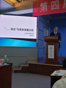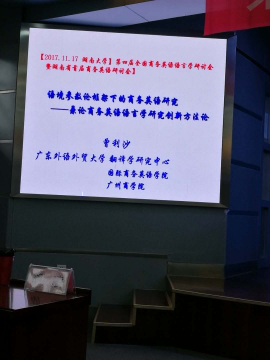 本次会议的主题是语言学在商务英语跨学科研究中的应用和创新。本次会议旨在促进商务英语学科理论发展和学术研究,探讨商务英语与语言学的交叉和融合,提升商务英语科研的水平和方法。会议期间,长江学者黄国文教授做了题为“商务沟通中语言多样性问题”的报告;中国认知语言学研究会会长以及上海外国语大学博士生导师束定芳教授做了题为“‥‥‥效应与商务语篇”的报告;教育部商务英语专业教学协作组组长王立非教授做了题为“中外上市企业话语多维特征对资本市场回报的相互影响研究”的报告;广东外语外贸大学翻译学研究中心博士生导师曾利沙教授做了题为“语境参数论框架下的商务语言问题研究”的报告。