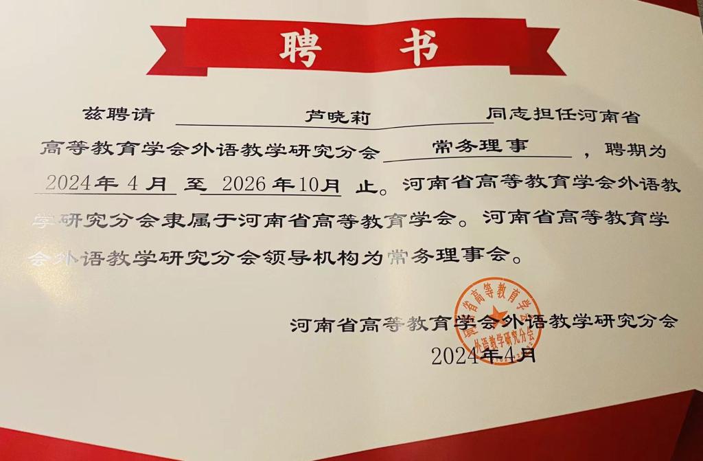 419日晚,河南省高等教育学会外语教学研究分会召开了第一届理事会第三次会议。会议选举并通过了增补副理事长、常务理事和理事人选名单。beat365在线平台官网外国语学院院长芦晓莉担任河南省高等教育学会外语教学研究分会常务理事。