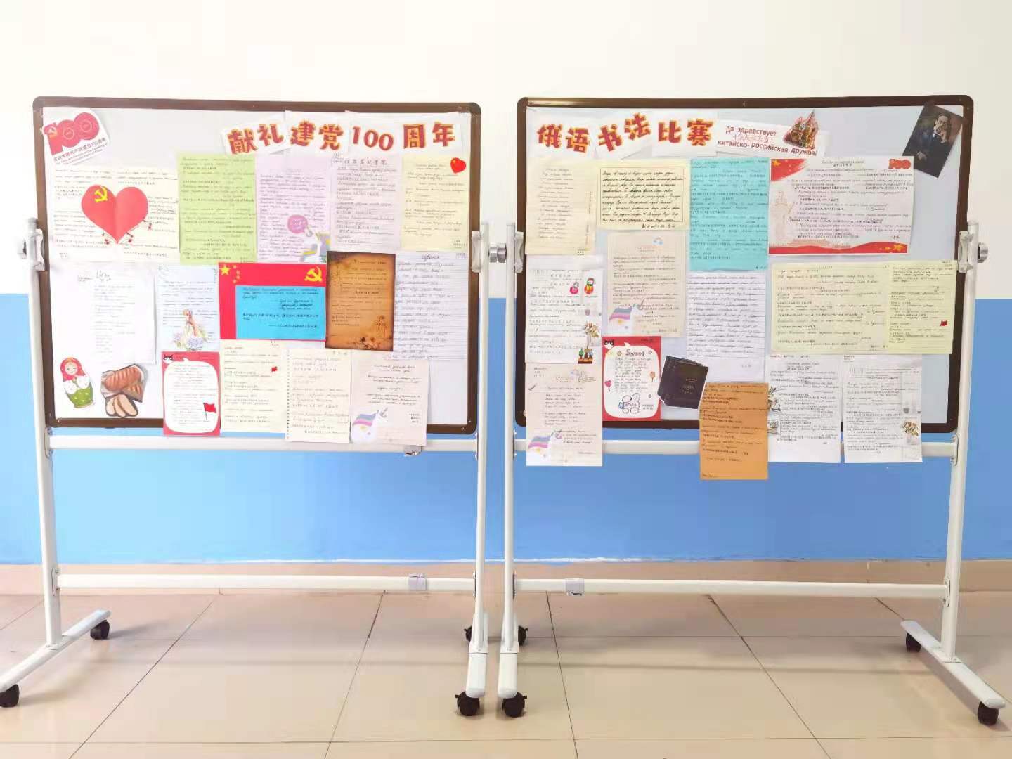 此次活动前期指导老师进行了认真的筹备并对学生悉心指导,学生书写的俄语和汉语内容均来自于人民日报、新华网等官方网站俄语频道的内容,其中大部分选自习近平新时代中国特色社会主义思想以及海外知名共产党人和国家元首对中国共产党的极高评价。