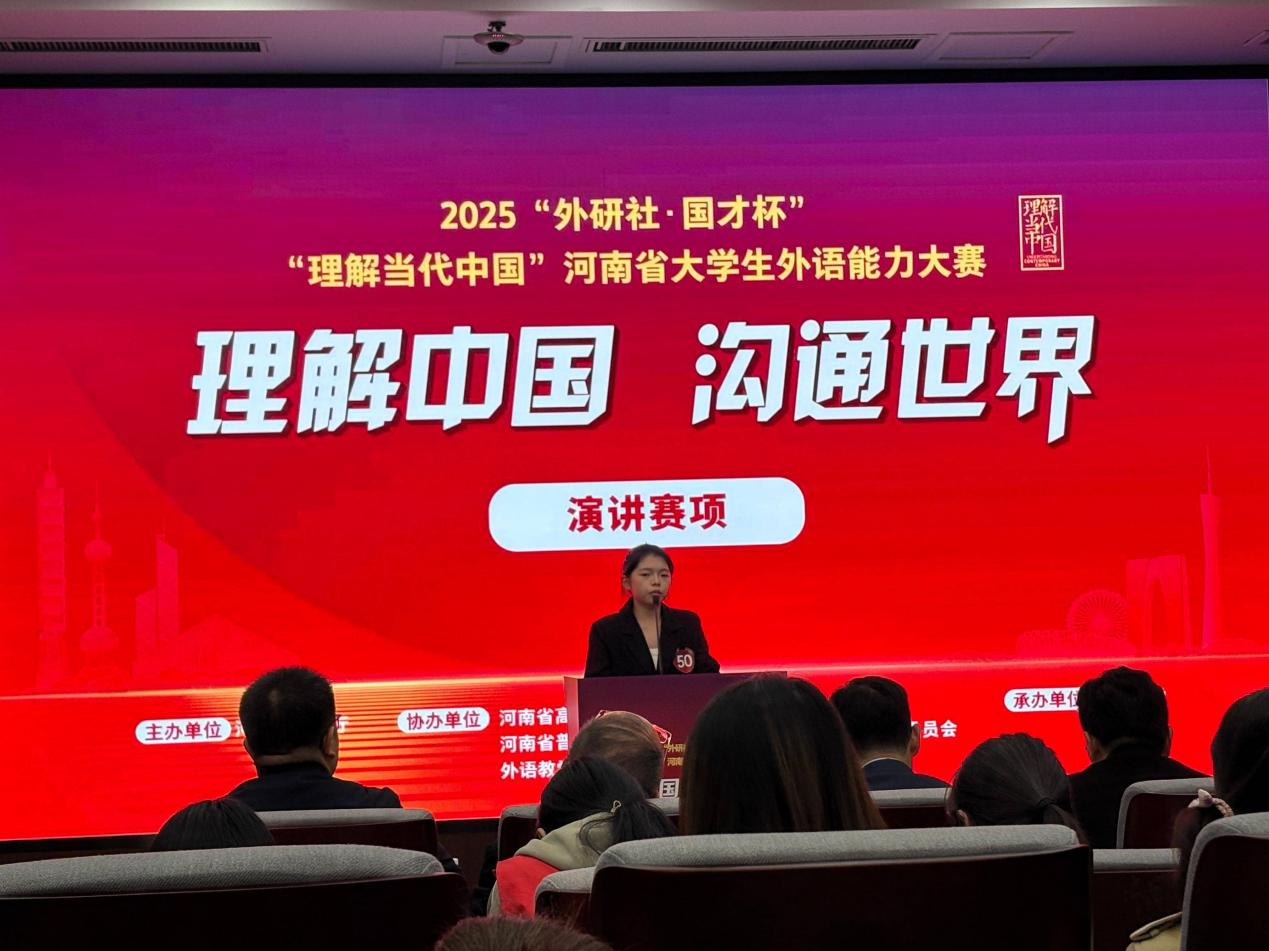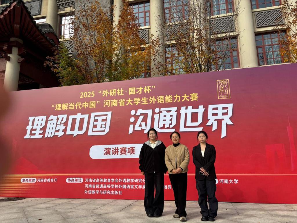 118日至9日,由河南省教育厅主办的2025“外研社·国才杯”“理解当代中国”河南省大学生外语能力大赛演讲赛项在河南大学郑州龙子湖校区顺利举行。外国语学院学子符芳菲和谢梦璇从校赛的众多选手中脱颖而出晋级省赛,并由外国语学院教师赵瑞带队,代表学校参加了此次比赛。最终,符芳菲凭借出色的表现,荣获河南省三等奖。