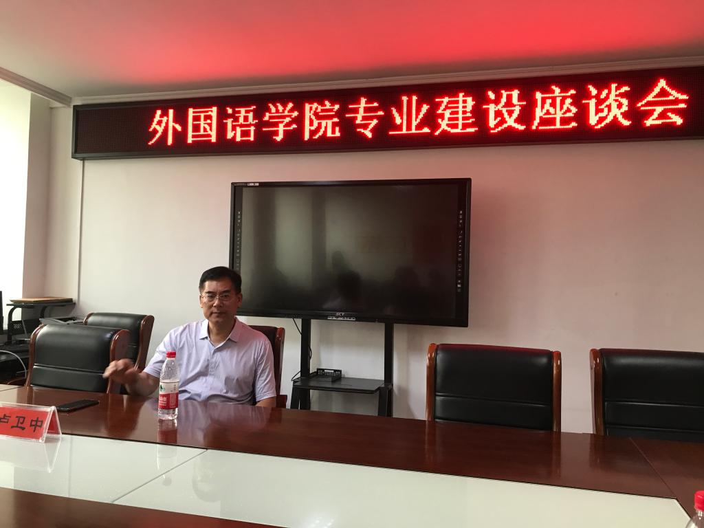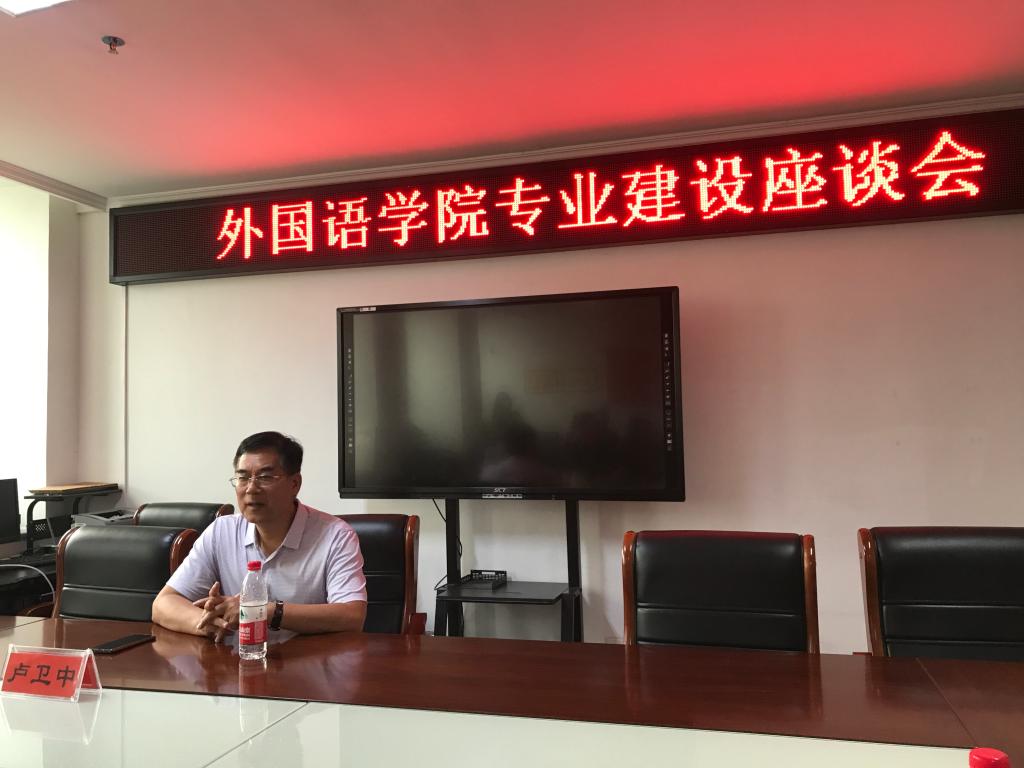 为进一步加强专业建设、促进学院内涵发展,2021年6月29日下午4点半,外国语学院在行政楼803会议室召开专业建设座谈会。本次座谈会特邀曲阜师范大学翻译学院院长卢卫中教授莅临指导,学院班子成员、商务英语、翻译和大学英语教研室代表老师出席座谈会,座谈会由院长滕海主持。