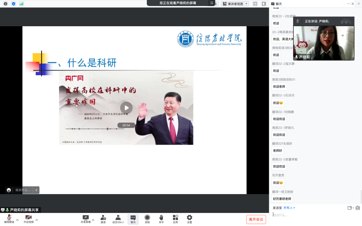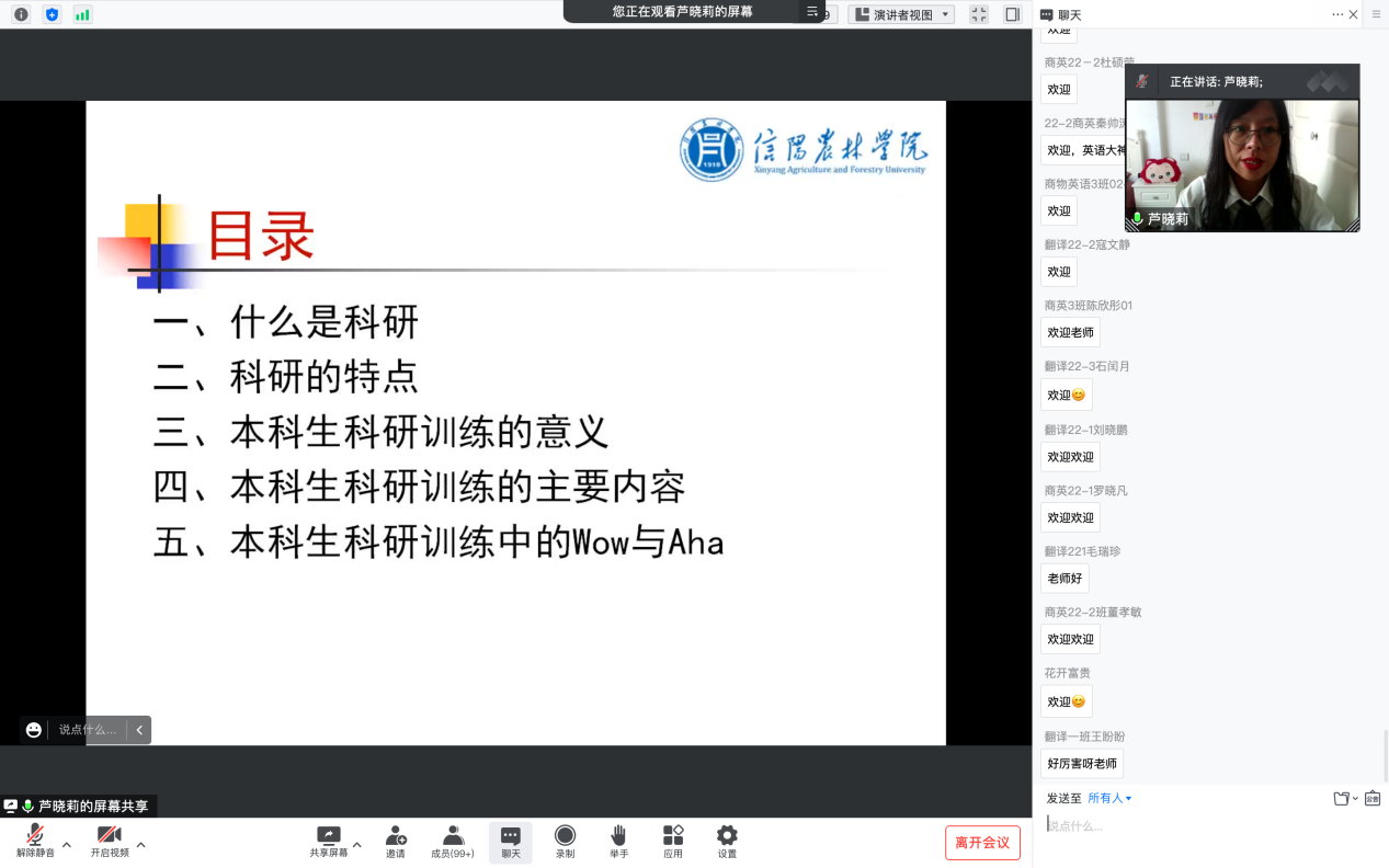 2022年9月14日上午10点30分至11点30分,外国语学院通过腾讯会议举办了2022级本科生科研素质培养报告会暨学院第一期博士论坛,外国语学院副院长芦晓莉博士担任本次报告会主讲人。2022级全体新生以及辅导员老师们聆听了本次报告会,会议由新生辅导员贾燕航老师主持。