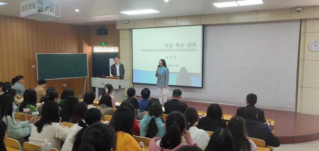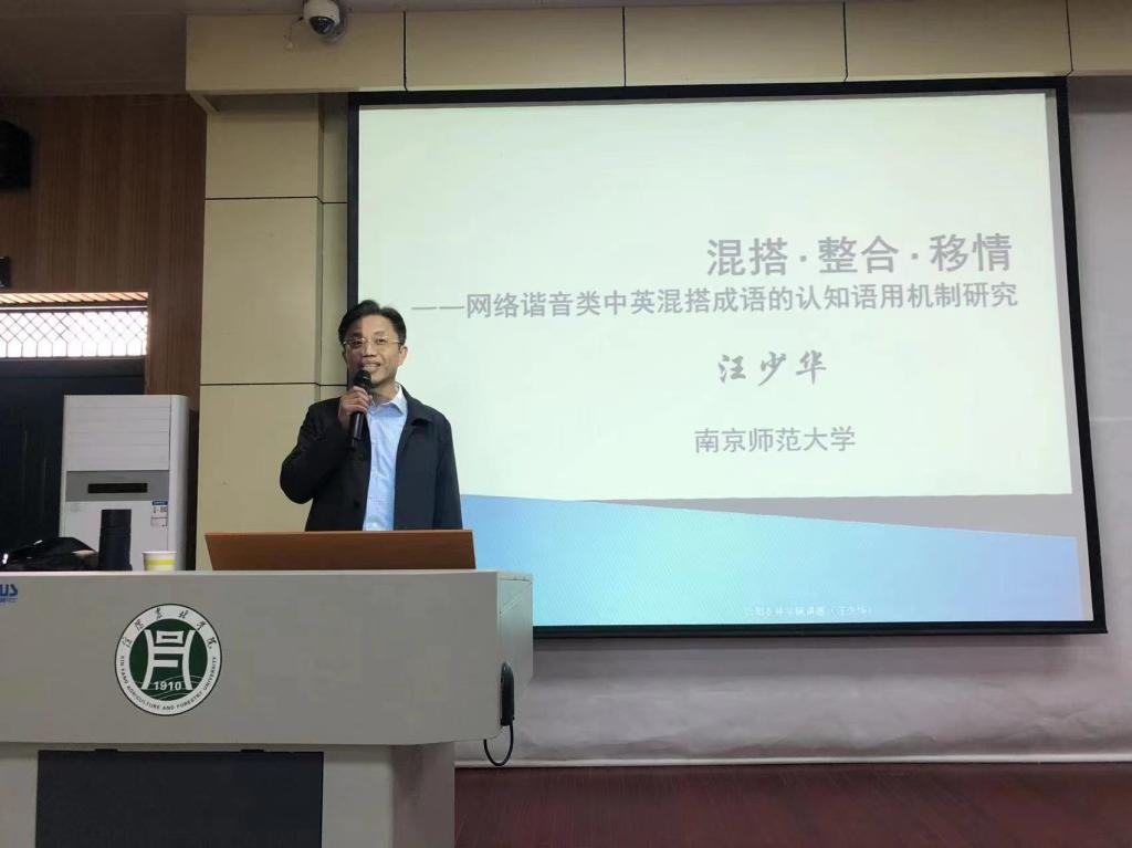425日下午15:00外国语学院特邀南京师范大学教授、博士生导师汪少华在二教204做了一场题为混搭·整合·移情——网络谐音类中英混搭成语的认知语用机制研究的学术报告。本次报告由科研副院长冯昱主持,全院专任教师及部分学生聆听了本次报告。