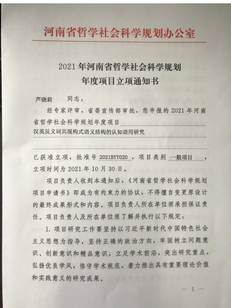 近日,河南省社会科学规划办公室公布了2021年度河南省哲学社科项目立项名单,我院芦晓莉博士主持申报的题为《汉英反义词共现构式语义结构的认知语用研究》项目获批立项,项目编号:2021BYY020。