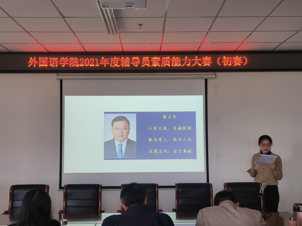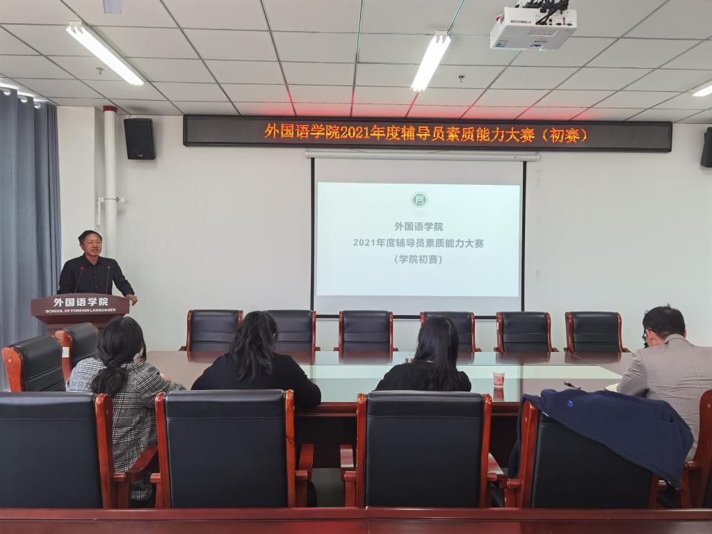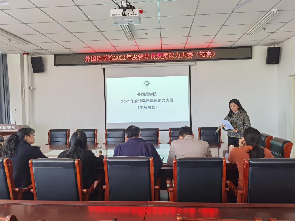 为进一步加强辅导员队伍建设,提升辅导员的职业技能和工作水平,推动我院辅导员职业化、专业化发展,11月18日中午,外国语学院在院办402举办了辅导员素质能力大赛初赛。党总支书记张志强、副书记吴宏、副院长芦晓莉、商务英语教研室主任张霞、翻译教研室主任王珺玥、商务英语党支部书记张录平受邀担任本次比赛的评委。