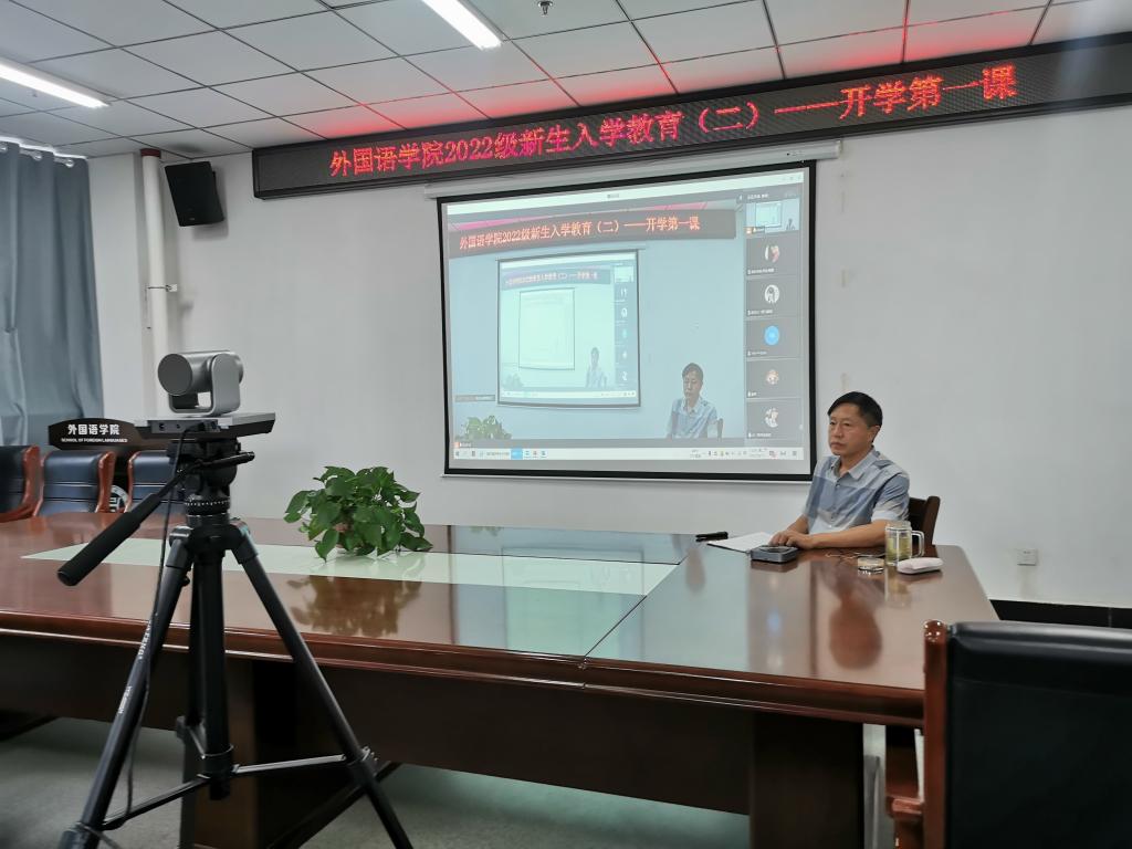 9月13日下午,外国语学院在线上开展了2022级新生入学教育系列活动(二)——开学第一课。院团总支书记高宇,2022级新生辅导员张淑娴、姜彬、贾燕航、魏君仪和全体新生共同聆听了党总支书记张志强的“努力实现中华民族伟大复兴的中国梦”主题教育讲座。