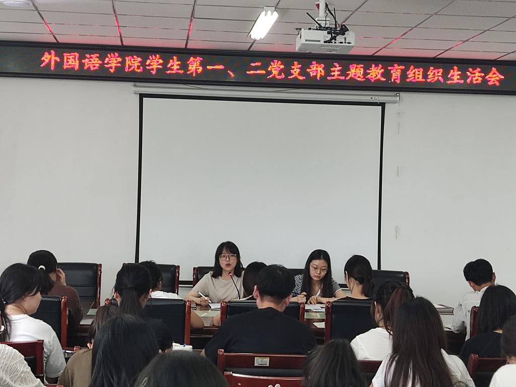 202394日,外国语学院第一、第二党支部在文学艺术中心402会议室召开学习贯彻习近平新时代中国特色社会主义思想主题教育专题组织生活会,由学生第一党支部书记高宇主持学生第一党支部全体学生党员参加会议。
