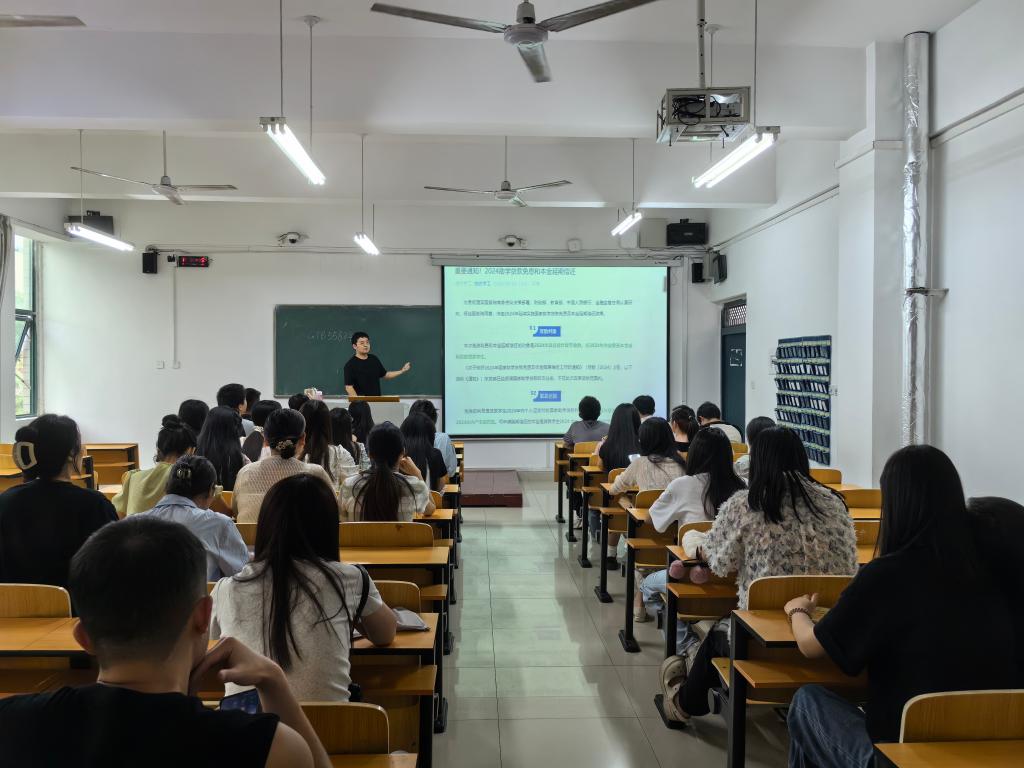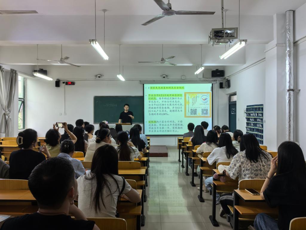 本次毕业生资助诚信教育讲座主要从四个方面展开,其一,讲解高校贷款和生源地贷款提前还款的注意事项,集中解答毕业生关于还款和征信的疑问。其二,介绍贷款展期的注意事项和基本流程,提醒升学学生按照基本步骤和时间节点进行办理贷款展期。其三,再次引导学生了解《财政部等部门关于做好2024年国家助学贷款免息及本金延期偿还工作的通知》,引导学生积极关注国家助学贷款政策;与此同时,也强调按时还款事宜,包括了解本金、利息和罚息,做到及时还款,诚信还款。其四,为贷款学生发放了《毕业生诚信还贷承诺书》等宣传材料,提醒学生诚信还贷。最后,张豫提醒学生怀感恩之心,做诚实之人,行诚信之事,砥砺奋斗,回馈社会。