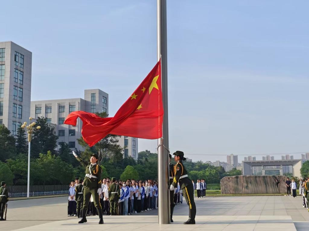 仪式上,国旗护卫队的队员们迈着整齐划一的步伐,护送着鲜艳的五星红旗走向旗台。在激昂的国歌声中,全体师生肃然伫立,行注目礼,见证着这一庄严时刻。