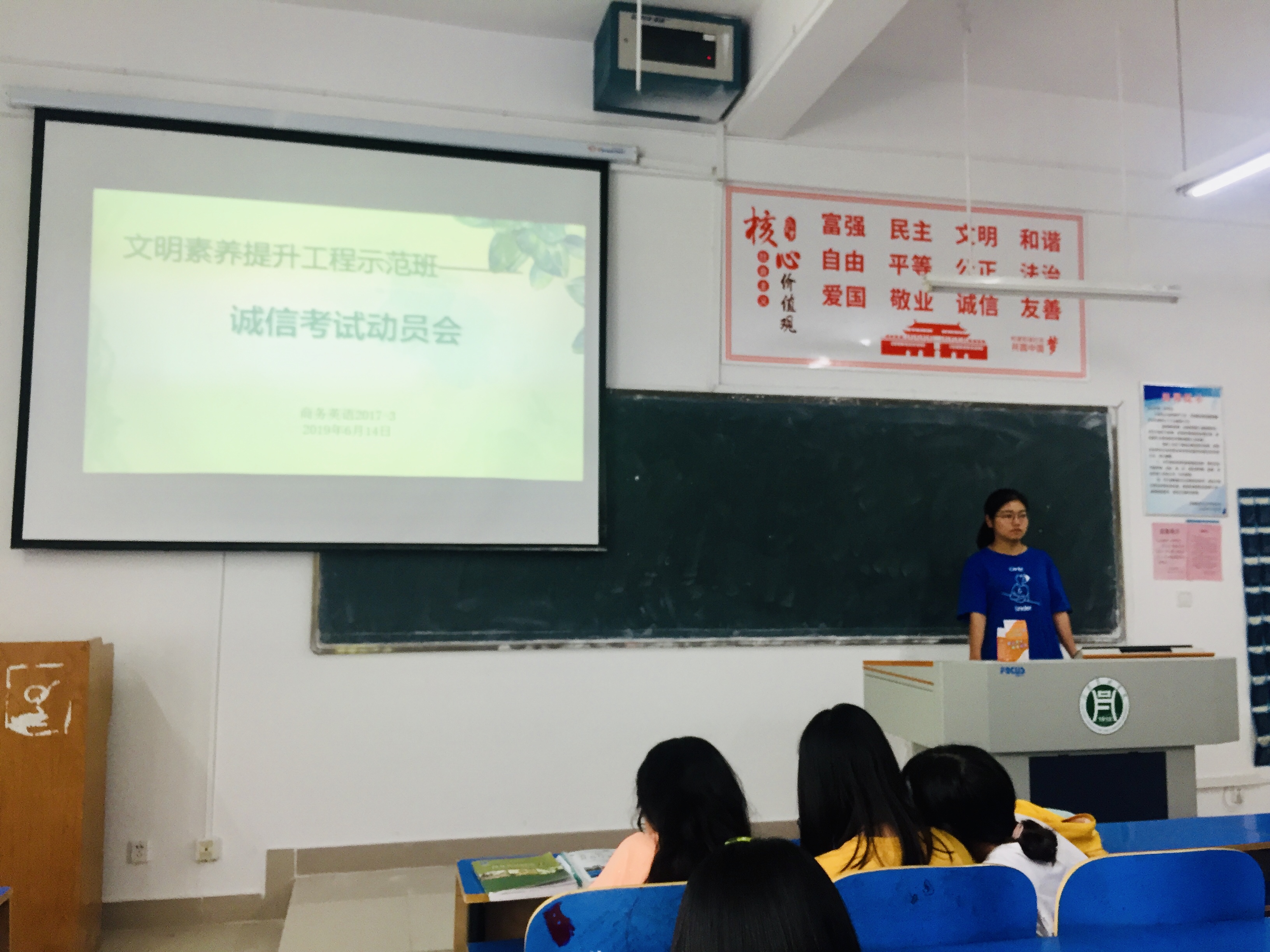 为进一步推动学风、考风建设,营造良好的诚信考试氛围,强化学生诚信意识614日,外国语学院文明素养提升工程示范班商务英语2017-3班在一教C101举行“文明考风 诚信考试”为主题的诚信考试动员班会。