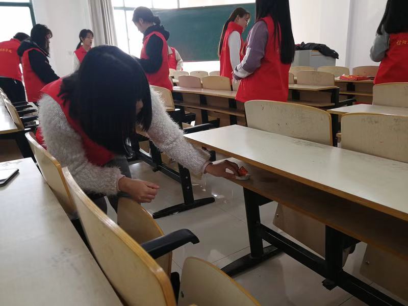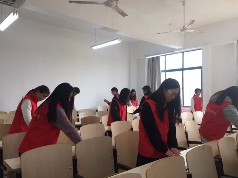 活动开始,同学们按时到教学楼的空教室,首先将教室里的黑板擦干净,并且用自带的抹布将黑板擦拭了一遍。同学们主动将布满灰尘的讲台收拾干净,为老师提供一个清洁的教学平台。对于一些桌椅凌乱的教室,同学们又齐心协力将桌椅摆放整齐,并将桌子上的垃圾倒入垃圾桶内,使前来上课的同学能够有一个整洁的学习环境。