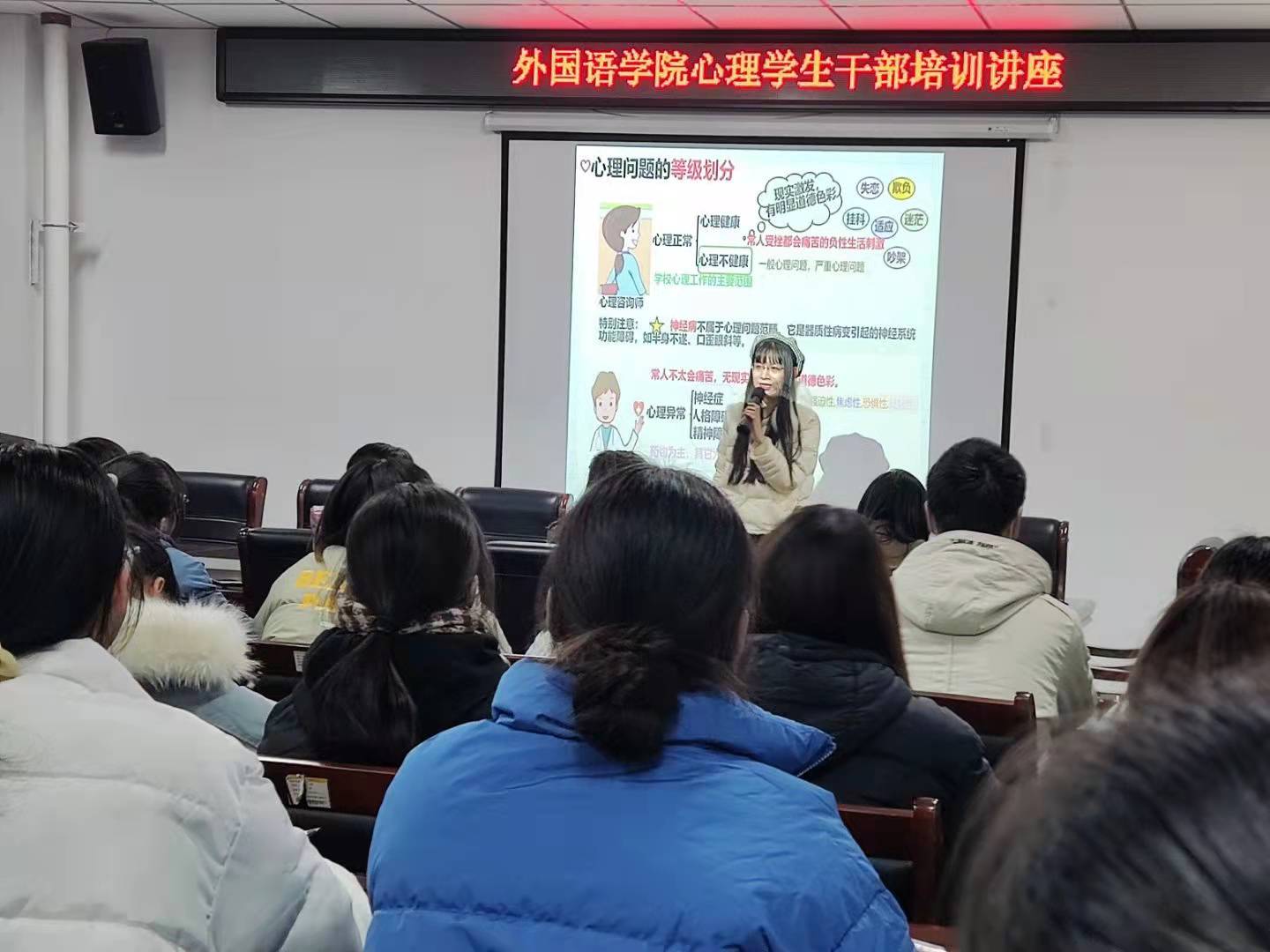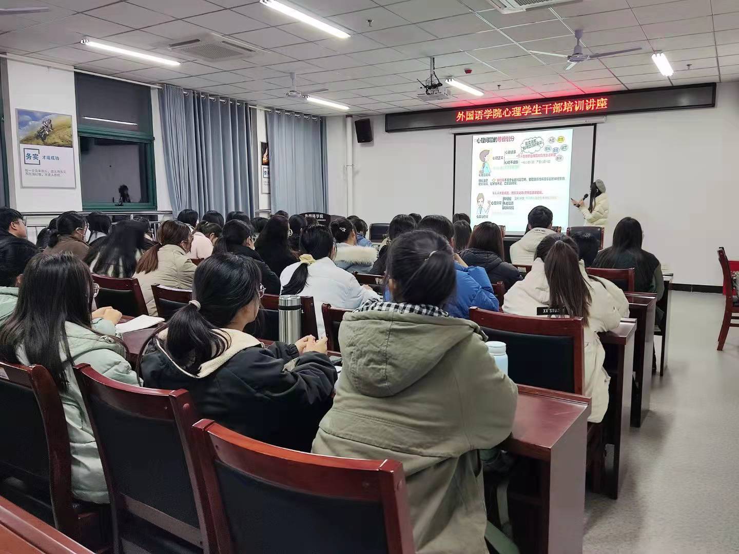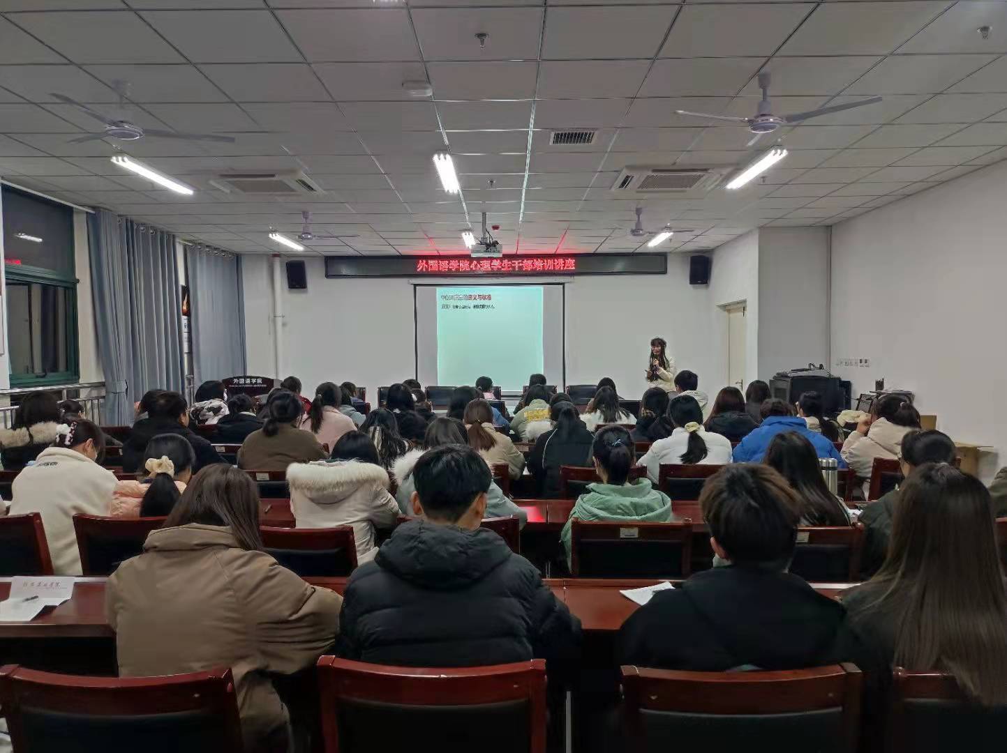 为使我院心理学生干部掌握更多心理专业技能,更好的实行心理健康自我教育、自我管理、自我服务,外国语学院于12月17日晚在文学艺术楼402开展心理学生干部培训讲座。心理健康与咨询中心杜鹃老师主讲,心理健康部成员、21级各班心理委员以及宿舍信息员参加此次培训讲座。