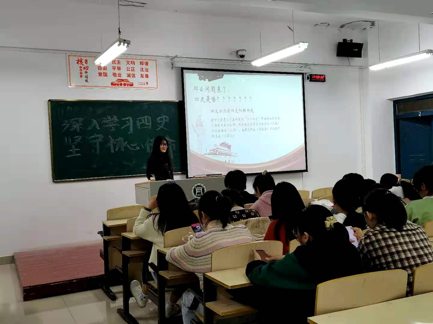 班会上,各班辅导员围绕四史教育的背景、内容及影响等方面,系统地向同学们介绍了“四史”的基本内涵,结合《建党伟业》、《建军大业》、《建国大业》等电影片段和历史事实,讲述了中国共产党创立、新中国成立、改革开放及社会主义发展以来的重大事件,强调在百年未有之大变局下,同学们更应回望历史,坚守初心。