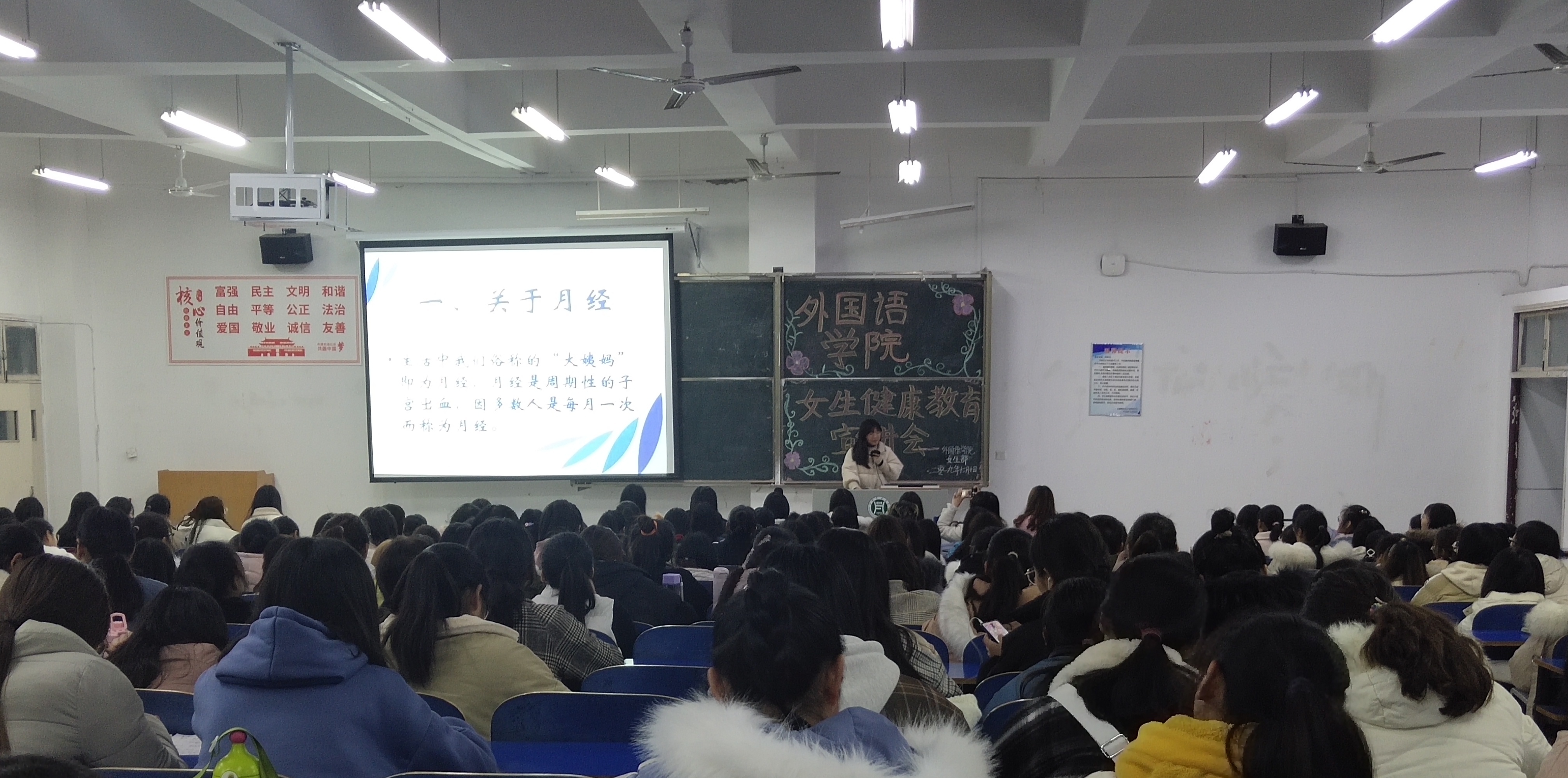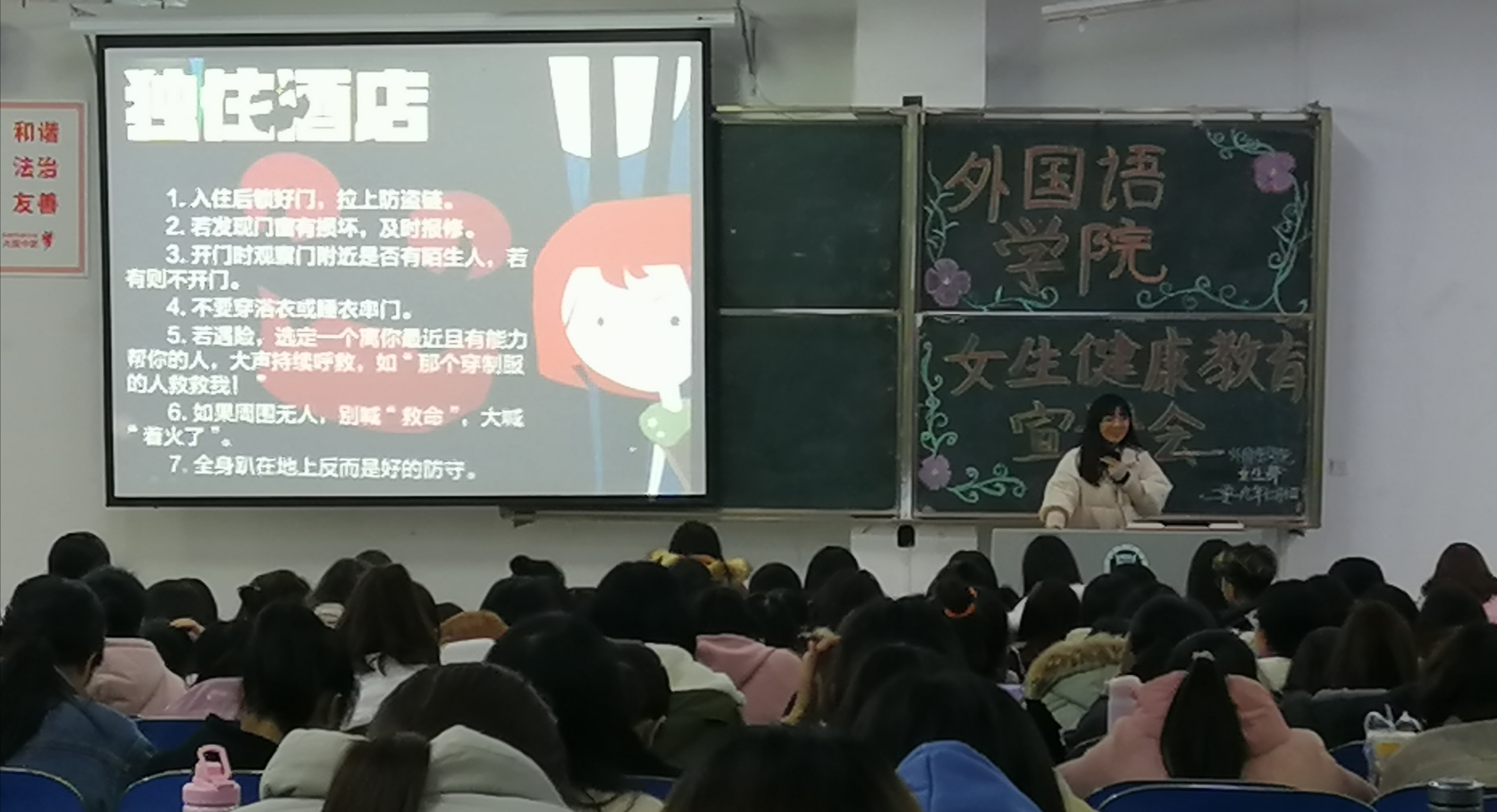 女生健康安全教育是高校工作的重要组成部分,为增强我院女生安全健康意识,帮助其身心健康快乐成长,20191210日晚外国语学院一教E102举办了以女生健康安全为主题的宣讲会,宣讲会由学生代表刘素红主持,我院 2019级全体女生及部分学生干部代表