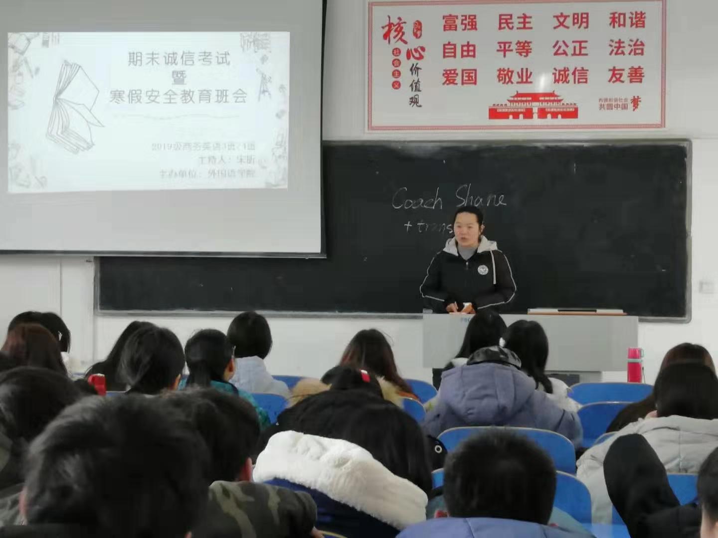为严肃考风考纪,进一步增强同学们的诚信意识,做好寒假安全教育工作,外国语学院于2019122627日分班级召开了诚信考试动员会暨寒假安全主题教育班会。