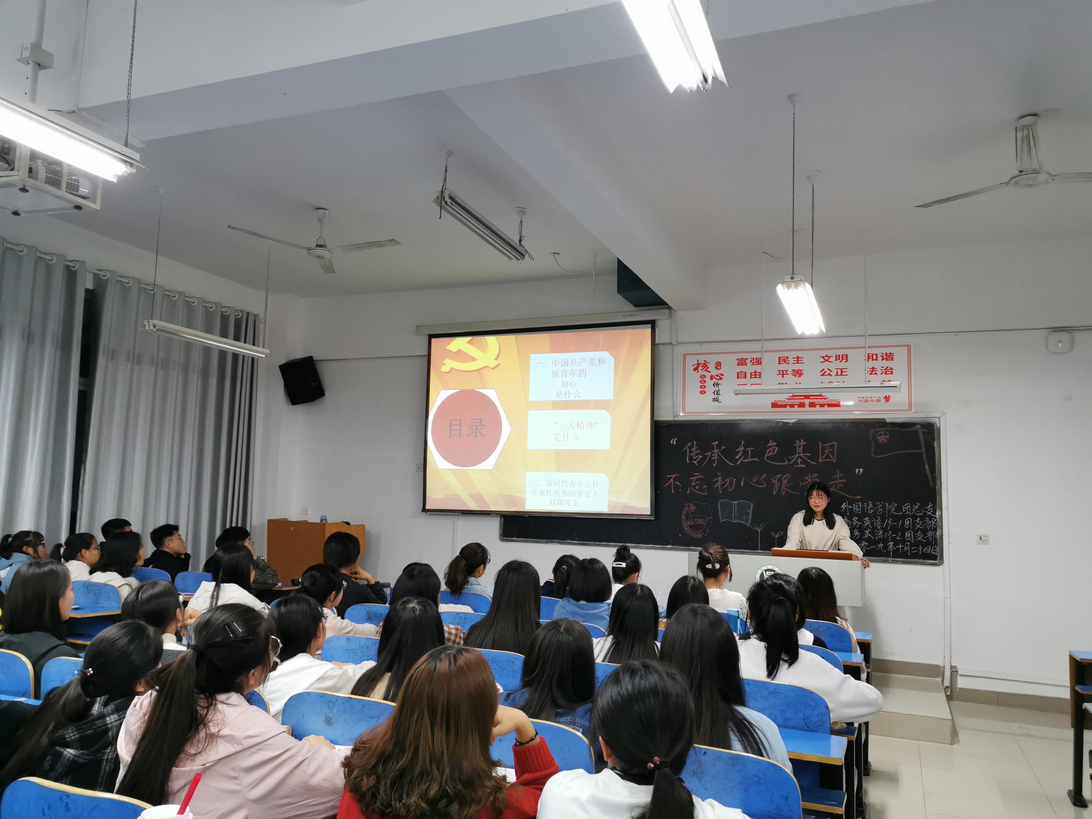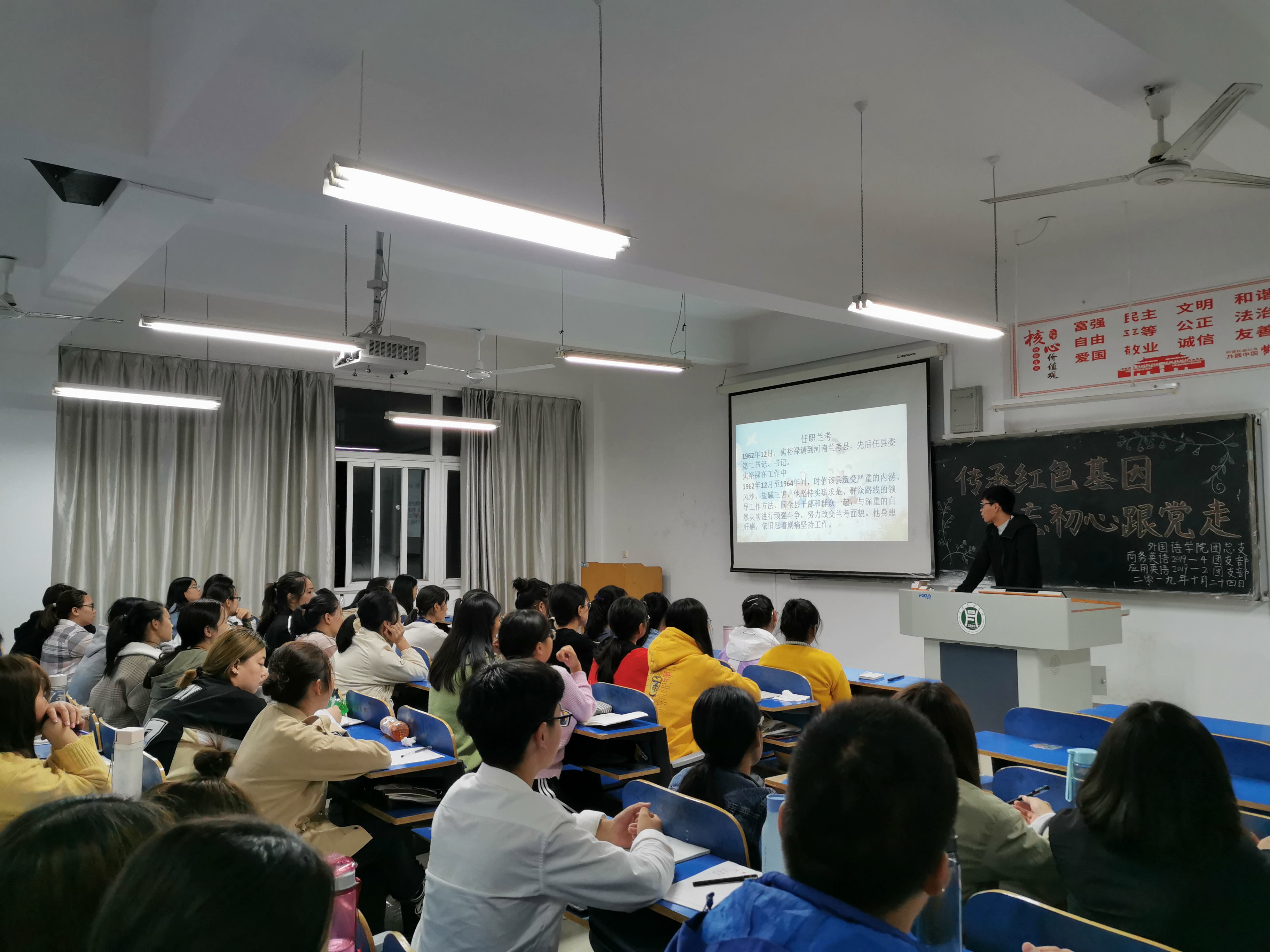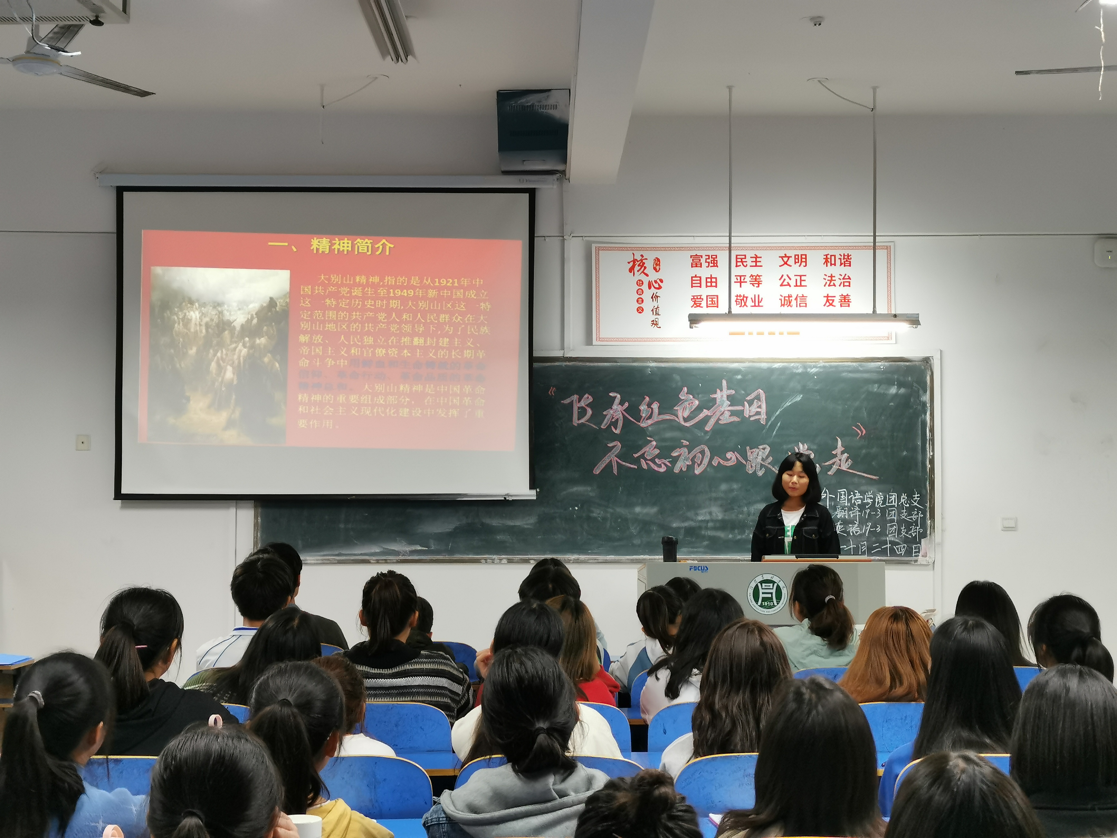 为深入学习贯彻习近平新时代中国特色社会主义思想,传承红色基因,牢记初心使命,弘扬大别山红色革命精神,学习革命先烈崇高品格。10月25日中午,外国语学院于二教306开展以“传承红色基因,不忘初心跟党走”的主题团日活动。本次团日活动由我院组织员、学工组组长吴宏主讲,2018级全体同学参加。