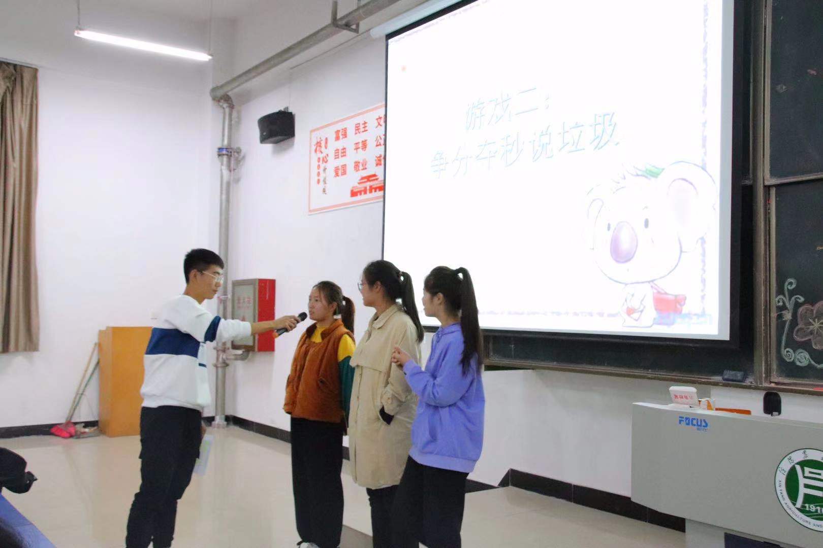 活动开始,由18级学生代表尹清杰进行活动宣讲发言,并通过垃圾分类宣传小视频向同学们介绍了其重要意义,加深了同学们对垃圾分类和环保的认识。活动进入游戏环节,紧张刺激的击鼓传花答题游戏带动同学们参与其中,并让大家更加深入地了解了垃圾分类相关知识。“争分夺秒说垃圾”,参与同学分为四组并根据该组的垃圾分类主题进行激烈角逐,活动氛围高涨,同学们在潜移默化中增强了垃圾正确归类的意识。紧接着进入问答环节,同学们踊跃抢答,积极参与,不仅实现了良好互动,也让同学们在游戏的过程中进一步了解了垃圾分类小常识。最后进行了“随机抽垃圾”的知识问答,由参与同学说出卡点视频上所显示垃圾的正确归类从而让同学们更真切地体会到垃圾分类就在我们身边,活动在一片欢笑声中接近尾声。17级学生代表李娟作了总结发言,希望大家了解垃圾分类常识,养成日常垃圾分类的好习惯。