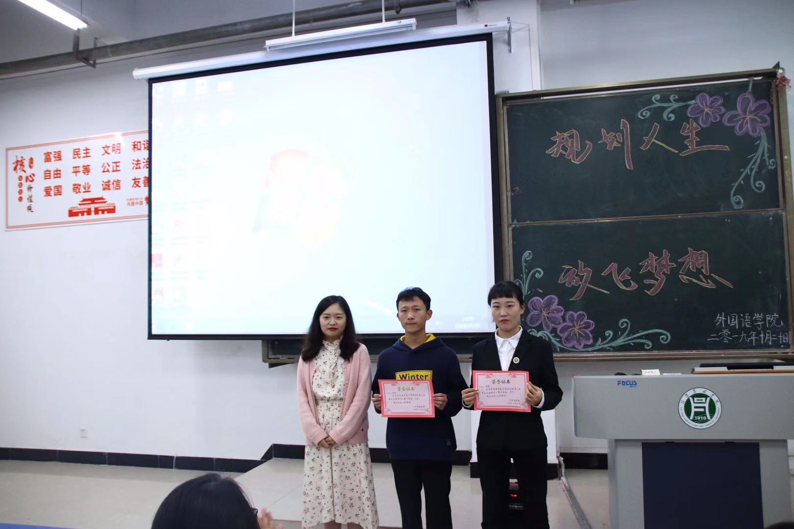 为进一步提升大学生职业生涯规划意识,引导大学生用科学的态度和方法规划自己的职业意向,1020日晚,外国语学院于一教E201举办了以“规划人生,放飞梦想”为主题的大学生职业生涯规划大赛初赛。我院团总支书记范琼琼、辅导员朱俊梵、韩江霞、高宇、学生干部代表及全体大一新生参加。