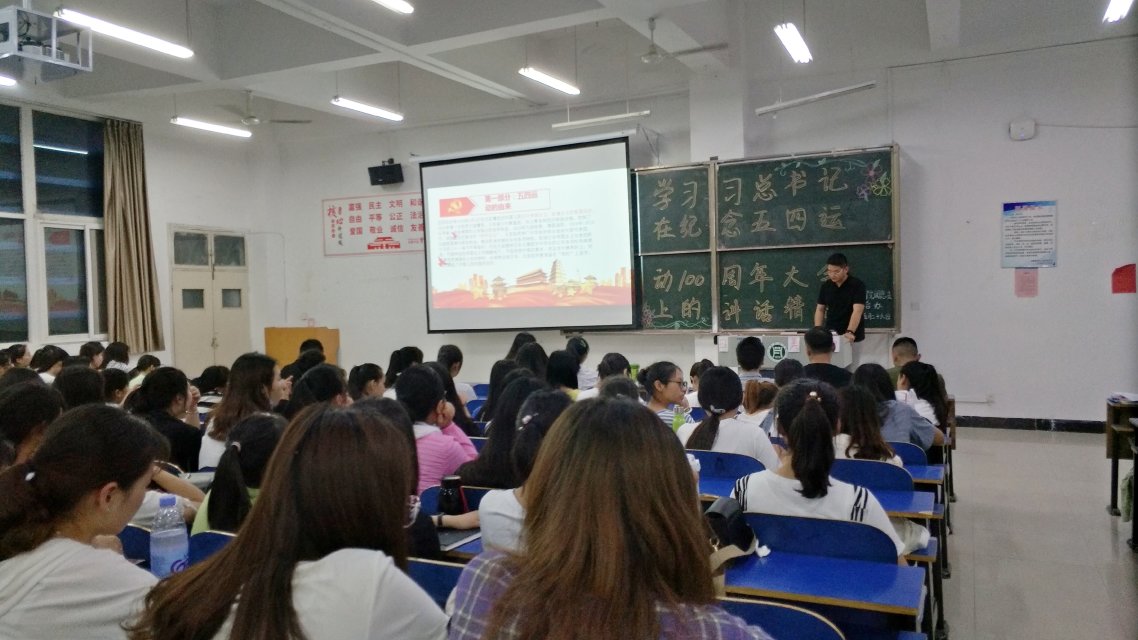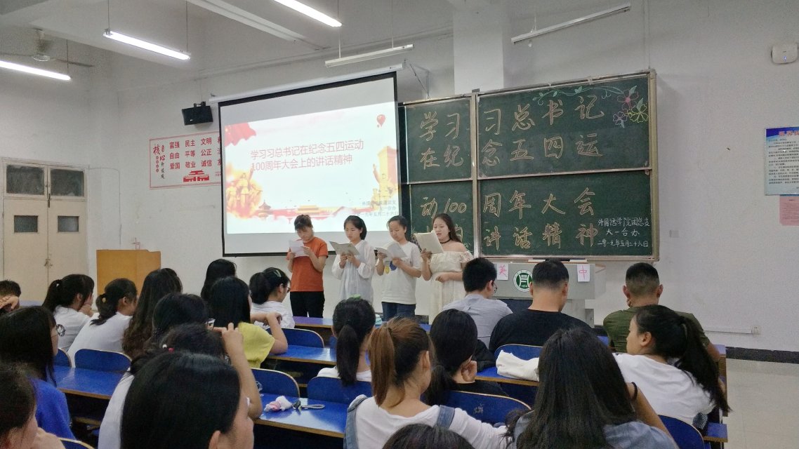 为了庆祝五四运动100周年纪念日,弘扬爱国、进步、民主、科学的五四精神,2019年5月26日19点30分,外国语学院在一教E102召开了以“学习习近平总书记在纪念五四运动100周年大会上的讲话精神"为主题的团日活动。