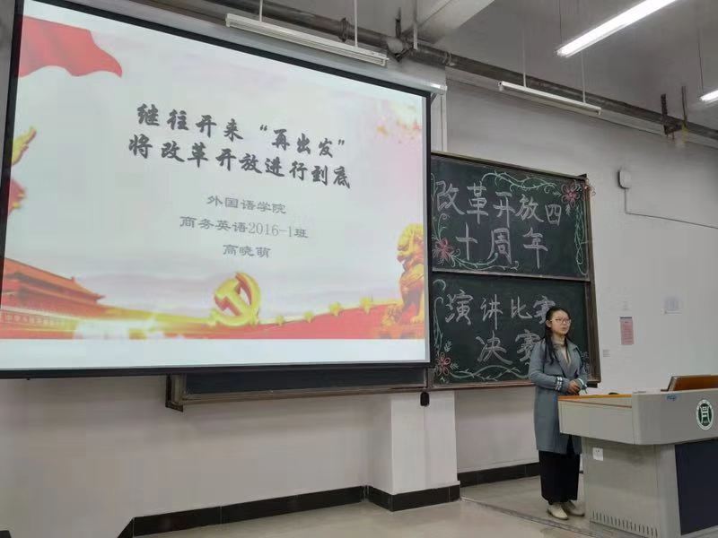为全面回顾改革开放的实践经验与创新成果,11月20日晚7时,外国语学院于E201举办了“改革开放40周年”主题演讲比赛。18级新生辅导员卜菀萌老师、以及全体大一学生参加了此次活动。