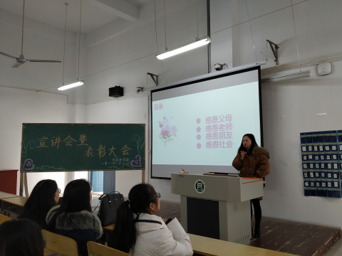 大会伊始,主持人对次宣讲会作了简短介绍。接着,朱俊梵老师分别从感恩父母、感恩老师、感恩朋友、感恩社会这四个方面向同学们讲解了什么是感恩以及如何感恩身边的人。最后,朱俊梵老师用两个暖心的公益广告视频呼吁大家常怀感恩之心。朱俊梵老师真挚饱满的感情,向大家传递了感恩的重要性,引起了在座同学们的强烈共鸣。大会在掌声中圆满结束。
