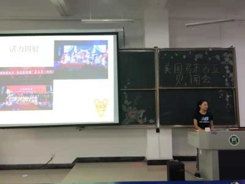 9月27日中午,外国语学院在E102召开了美国、马来西亚访学交流会。会议由我院新生辅导员主持,2016级商务英语专业马雨、杨一铭及2015级商务英语专业胡先丽作为主讲嘉宾参会。