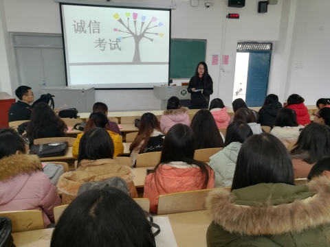 本学期期末前,外国语学院文明示范班2016级商务英语三班全体同学积极申请了期末考试的“诚信考场”。考前,为了进一步加强考风考纪,营造良好的学习氛围和公平考试环境,增强示范班学生诚信意识,避免考试违纪现象发生,1月10日,2016级商务英语三班全体同学在二教206召开了“诚信考场”动员会,会议由辅导员黄琳老师主持。