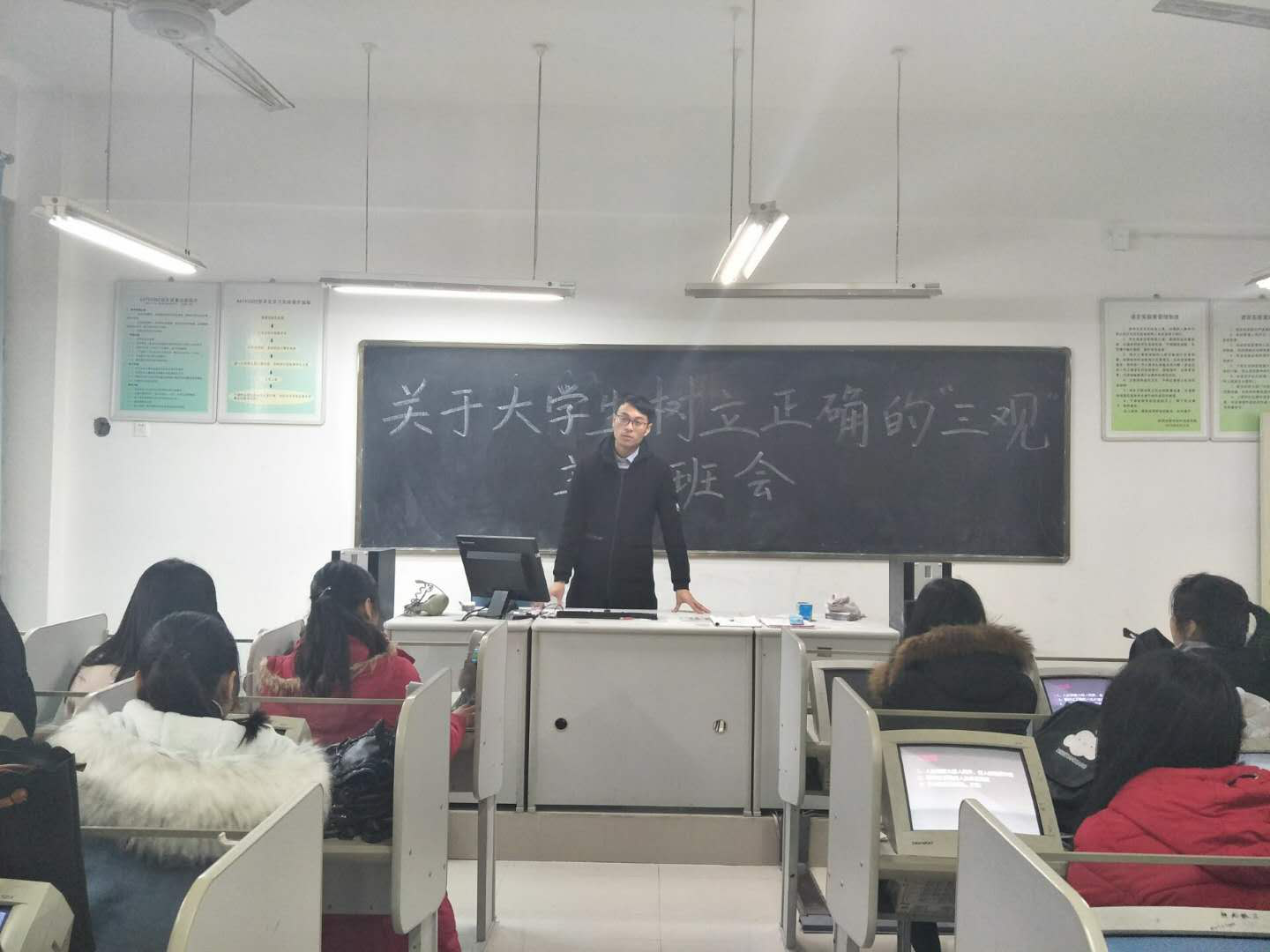 为了让大学生有一个健康的大学价值观念,2017年12月15日,外国语学院16级商务英语一班与商务英语三班联合在2B404教室开展了一次关于大学生树立正确的“三观”主题班会。