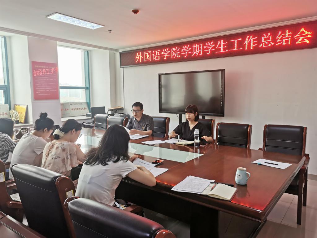 7月1日下午,外国语学院于行政楼803召开学期学生工作总结会。外国语学院党总支副书记吴宏、团总支书记范琼琼以及全体专兼职辅导员老师参会。
