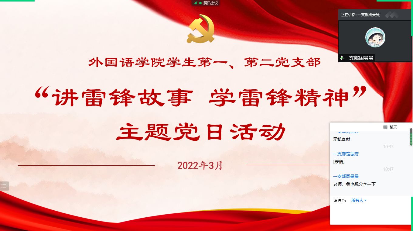 2022年3月27日,外国语学院学生第一、第二党支部开展了“讲雷锋故事 学雷锋精神”主题党日活动。活动由外国语学院学生第一党支部书记高宇主持,学生第二党支部书记赵瑞及学生支部全体党员参加。
