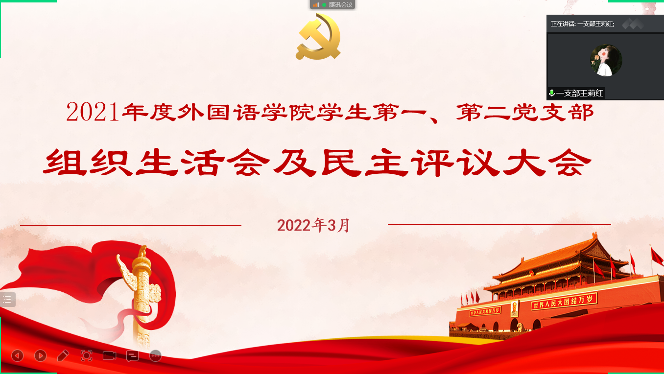 按照《beat365在线平台官网2021年度党支部组织生活会和开展民主评议党员实施方案》的要求,2022年3月8日,外国语学院学生第一、第二党支部召开了2021年度组织生活会及民主评议党员大会。会议由外国语学院学生第一党支部书记高宇主持,学生第二党支部书记赵瑞及学生支部全体党员参加。
