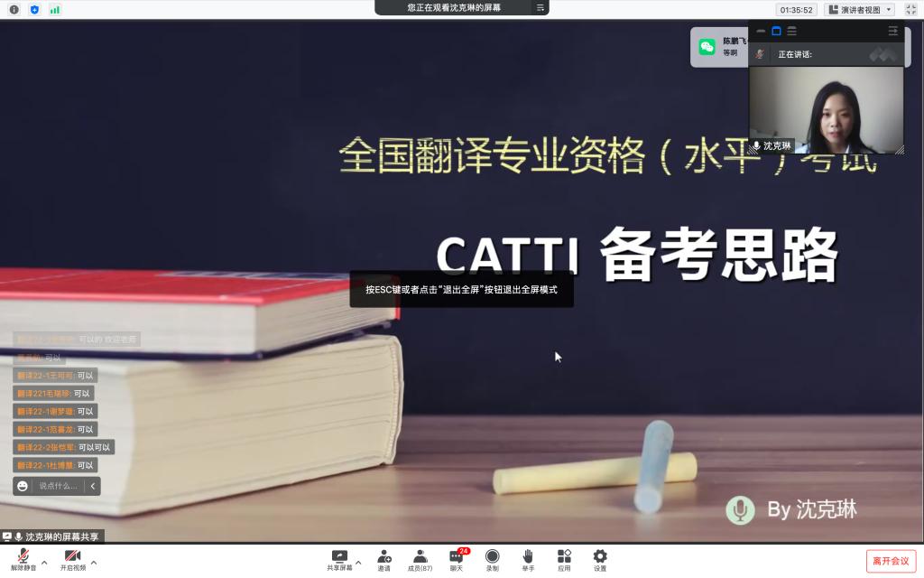 接着,沈克琳老师为大家全面梳理了翻译专业资格考试CATTI的大致备考思路,介绍了翻译资格证书的重要性,鼓励同学们从词汇积累开始培养英语基本功,从语法学习夯实英语水平,做到理论与实践相结合,努力考取相关证书,为今后的职业生涯奠定基础。