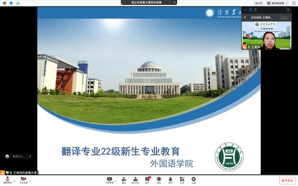 2022年9月16日,我院开展翻译专业22级新生翻译专业思想教育。翻译专业全体新生和辅导员及翻译教研室教师参会。翻译专业教研室主任王珺玥老师及教师代表张豫老师、沈克琳老师、闫达老师和韩江霞依次在线上为同学们做专业介绍并答疑解惑,会议由辅导员魏君仪老师主持。