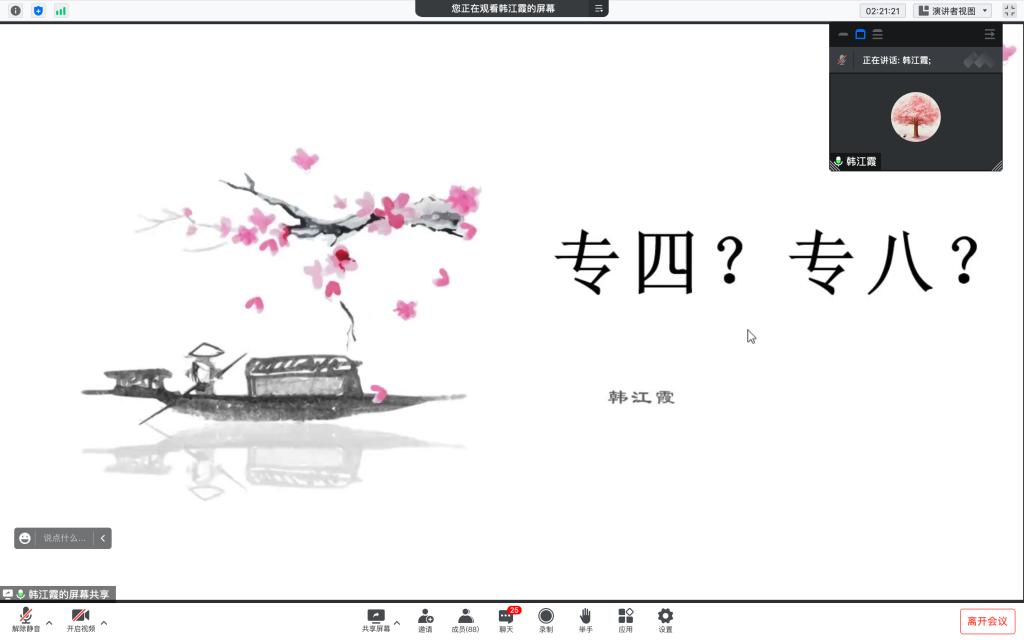 最后,韩江霞老师为同学们详细讲解了英语专业常见证书的分类,其中强调了含金量最高的英语专业四级和八级证书的重要性和特殊性,包括题型分值占比和考试时间、备考方法。并介绍了18级翻译专业学生证书考取情况,以生动的例子引导学生培养学习的主动性,努力提高知识储备量,拓宽知识面,增强自身的专业水平。
