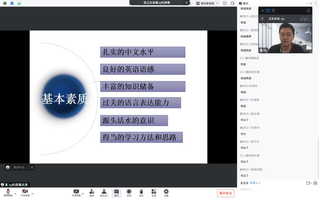 接着,张豫老师给大家详细讲解了翻译专业学生应具备的基本素质:既要有丰富的知识储备,过关的语言表达能力,也要有扎实的中文水平;通过培养与时俱进的意识,掌握得当的学习方法和思路,拥有一个精彩充实的大学生活。