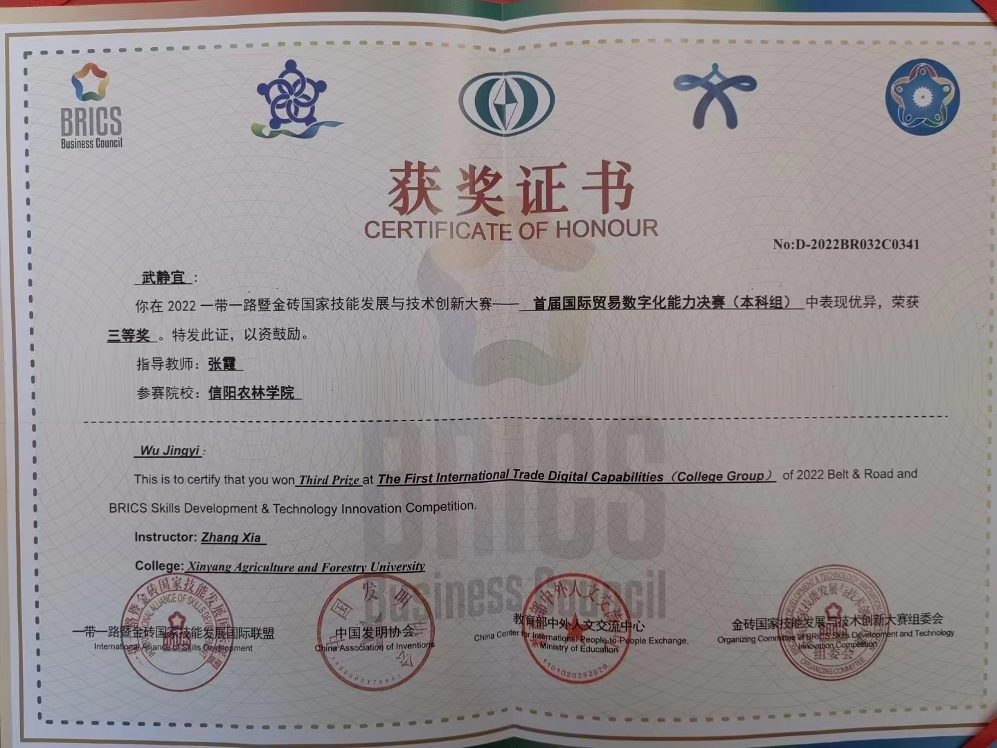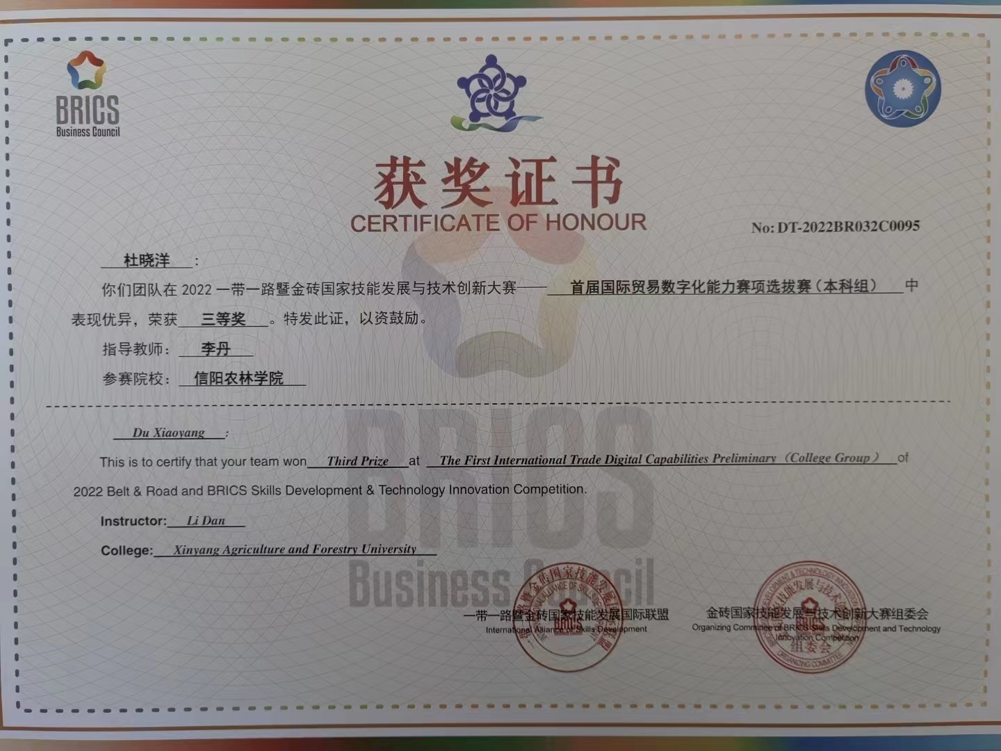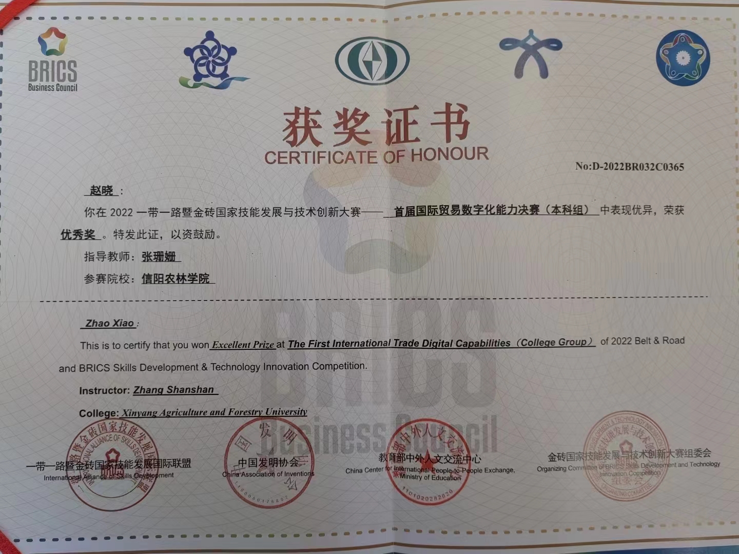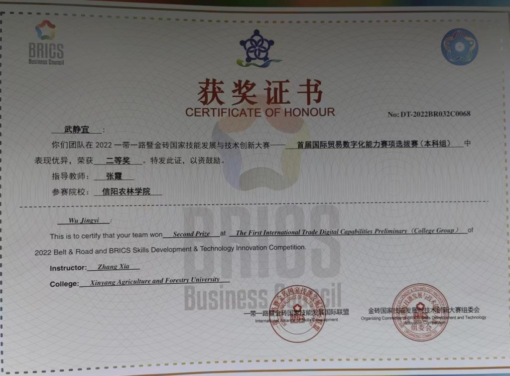 近日,金砖国家技能发展与技术创新大赛组委会传来喜讯,外国语学院商务英语专业学生在2022一带一路暨金砖国家技能发展与技术创新大赛——首届国际贸易数字化能力决赛中荣获团队二等奖1项、三等奖2项;个人二等奖、三等奖各1项,优秀奖2项。beat365在线平台官网在组织工作中,表现突出,被授予优秀组织奖。