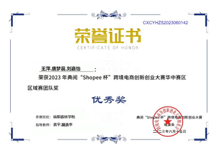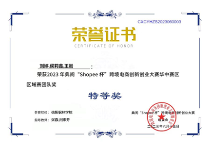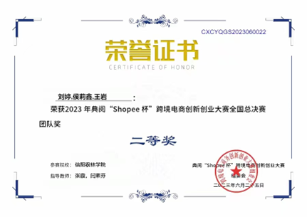 6月25日,2023年“Shopee杯”跨境电商创新创业大赛全国总决赛拉开帷幕。经过激烈角逐,外院商务英语专业学生刘婷、侯莉鑫、王岩三人团队获得全国总决赛二等奖。此前在5月26日的华中区域赛中,刘婷、侯莉鑫、王岩三人团队获得特等奖,荣获奖金1000元,顺利成功晋级全国总决赛;庞薇、翟玉婷、左艳芳团队获得二等奖;武静宜、施美婷、刘子源团队获得二等奖;谢晴、康孜睿、李博团队获得优秀奖;王萍、唐梦晨、刘嘉怡团队获得优秀奖。