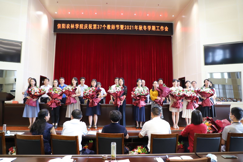 会议表彰了河南省高校黄大年式教师团队——茶学教师团队等省级荣誉先进单位和个人获奖者、2021年度学校“教学名师”和“师德标兵”。校领导向受表彰的教师代表送上鲜花表示祝贺。获奖教师代表、省级教学名师杨俊杰教授作了发言。会议传达学习了省委工作会议精神。