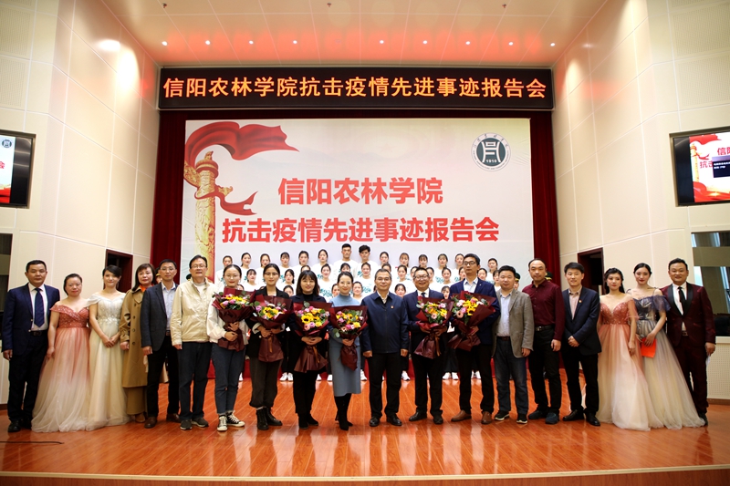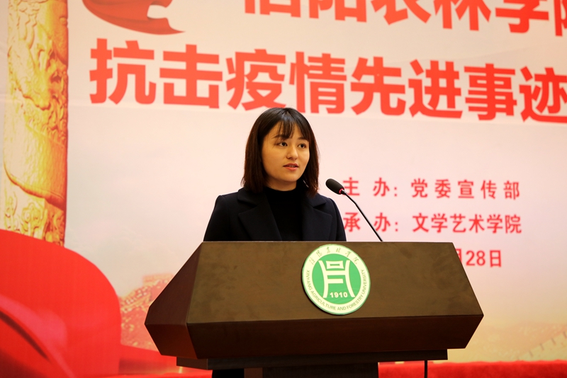 工商管理学院党总支书记蔡志、生物与制药工程学院教师商天奕、食品学院教师邬全喜、后勤管理处(后勤服务总公司)教师李青锦、外国语学院学生翟珂、水产学院学生郝丽丽等六位抗击疫情先进个人代表依次作了主题发言,他们中有疫情期间坚守脱贫攻坚前线的驻村第一书记,有灵活运用抖音直播等平台上网课的一线教师,有为家乡防疫人员和交通管理人员提供免费工作餐的志愿者,有保障全校师生健康安全的后勤工作者,还有制作以抗击疫情为主题的葫芦烙画作品、发动本校同学和社会人士募捐的同学们……他们勇于担当、甘于奉献,聚涓滴之力,护山河无恙,他们是千万个信农儿女的代表,激励着全体信农师生为学校、社会、国家事业的建设发展肩负更大使命、贡献更多力量。