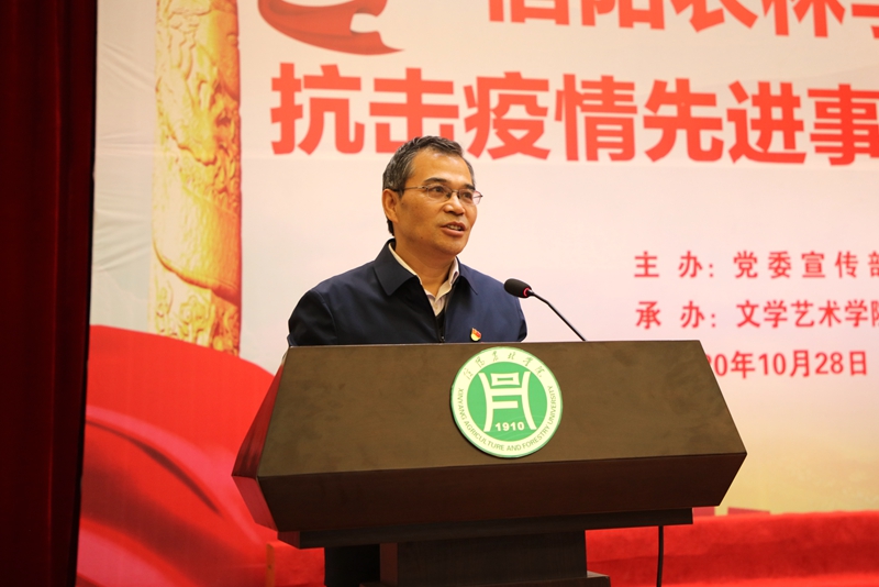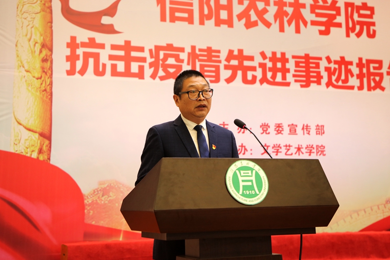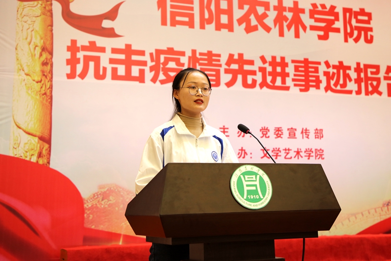 10月28日下午,由校党委宣传部主办、文学艺术学院承办的beat365在线平台官网抗击新冠肺炎疫情先进事迹报告会在beat365在线平台官网图书馆6楼报告厅举办。在这场以“把灾难当教材 与祖国共成长”为主题的特别报告会上,抗击疫情先进个人代表作了主题发言,讲述了信农师生感人的抗疫故事。党委副书记王庆兵主持报告会,相关职能部门负责同志,各党总支书记、副书记,团总支书记、辅导员、师生代表参加报告会。