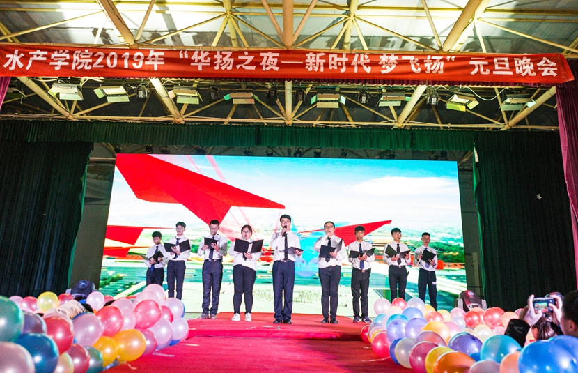 12月27日晚,水产学院在大学生活动中心举办“华扬之夜——新时代•梦飞扬”2019元旦晚会。副校长赵一鹏、王庆兵和水产学院院长杨东辉、党总支书记郭旭升、武汉华扬动物保健集团水产事业部经理张玉华等与师生一起共庆元旦。晚会开始,水产学院的吉祥物——小海豚精彩亮相,并带来舞蹈串烧表演。小品《上学那些事儿》、歌曲《风吹麦浪》、相声《智取威虎山》、爵士舞《SO HOT》、心理剧《说不出的爱》、武术表演《霍元甲》《中华颂》、舞蹈《爱》、魔术表演《消失的水》赢得了观众的阵阵掌声。最后,水产学院全体老师走上舞台,与同学们一起合唱歌曲《明天会更好》。