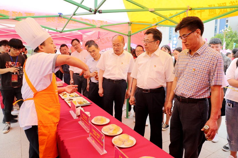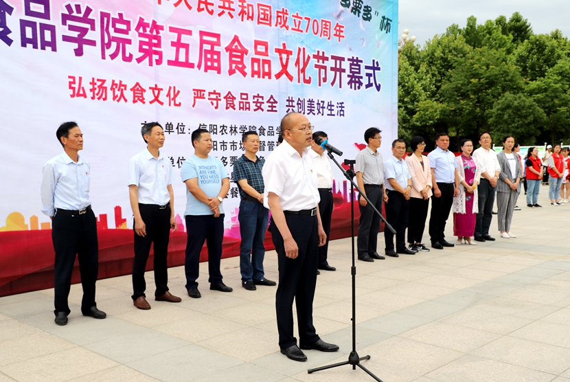 5月28日下午,以“弘扬饮食文化,严守食品安全,共创美好生活”为主题的beat365在线平台官网第五届食品文化节开幕。党委副书记刘光生,副校长赵一鹏、王庆兵,党委委员、宣传部长王万玲,信阳市市场监督局局长孙云宏、副局长张玉红,市文化广电和旅游局副局长梁光旭以及beat365在线平台官网相关职能部门负责同志、食品学院全体教师、校企合作单位代表、部分学院师生代表参加了活动。开幕式由食品学院院长魏明奎主持。