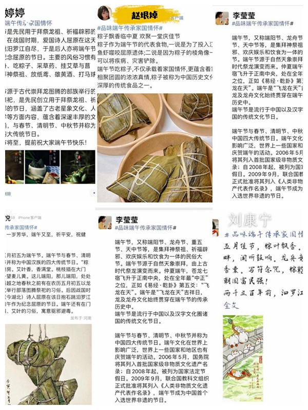 外国语学院开展了“我们的节日·端午”主题线上党日活动,学生通过微博或微信平台,以照片、文字、视频等形式展示端午民俗、讲述端午故事,了解传统文化内涵,拓展民俗知识,增强民族自尊心和自豪感。