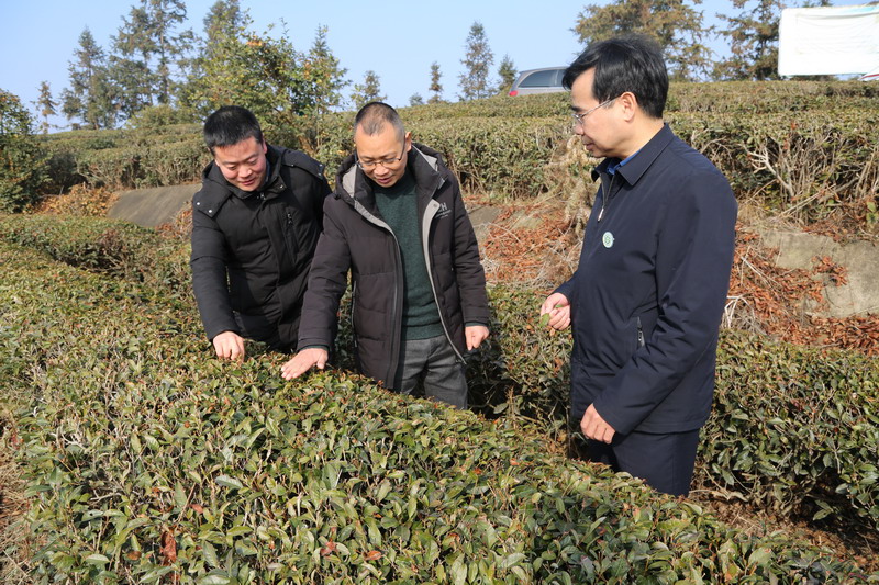 在罗山县潘新镇申林茶叶开发有限公司万亩茶园,服务队成员通过多点取样法对茶树生长状况进行详细调查,然后针对茶园土壤养分供给不足等问题提供了科学的解决方案,即撒施适量的茶叶专用配方肥,确保春茶采摘期土壤肥力持续供应,实现春茶增产增收和品质提升。在公司的标准化、生态化示范茶园建设现场,服务队专家就茶树品种引进、机械化配套设施、茶文旅融合等亟需解决的问题与公司负责人马健进行了交流与沟通。针对公司新开发的砖茶产品存在“发花”密度不高等技术难题,茶学专家王广铭副教授、尹鹏博士等根据自身的专业特长进行了指导,将此产业中出现的难题作为今后科学研究的课题,开展技术攻关。植保专家史洪中和陈利军教授、郭世保博士认真查看了当前茶园生长情况病虫害越冬基数,提出绿色防控技术方案。范宏伟副教授指出当前应该适当对茶树枯枝进行修剪,以增加开采期的发芽密度,同时要加强水肥管理,可撒施专用配方肥以增加开采期的产量和品质。