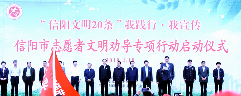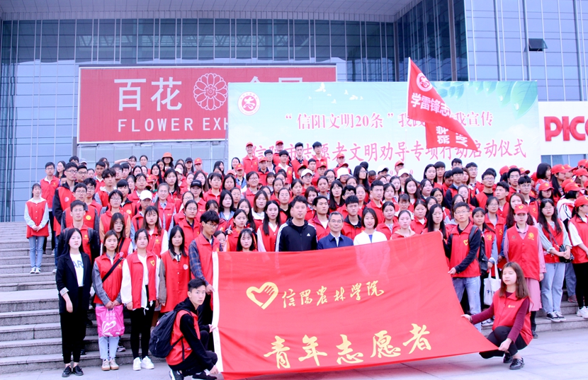 4月19日上午,信阳市志愿者文明劝导专项行动启动仪式在信阳市羊山新区百花会展中心举行。副校长王庆兵和相关负责老师带领一百余名志愿者和十余名礼仪队同学参加了此次活动。