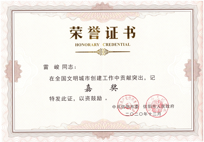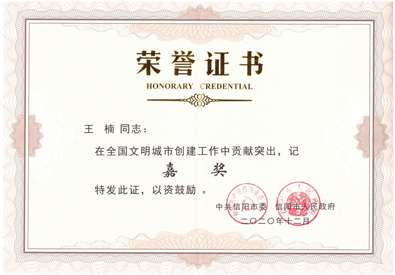 12月26日,信阳市举行创建全国文明城市总结表彰大会,对在全国文明城市创建工作中涌现出的先进单位、先进个人和文明市民予以表彰。beat365在线平台官网获集体嘉奖,党委宣传部雷峻、王楠两位同志获个人嘉奖。