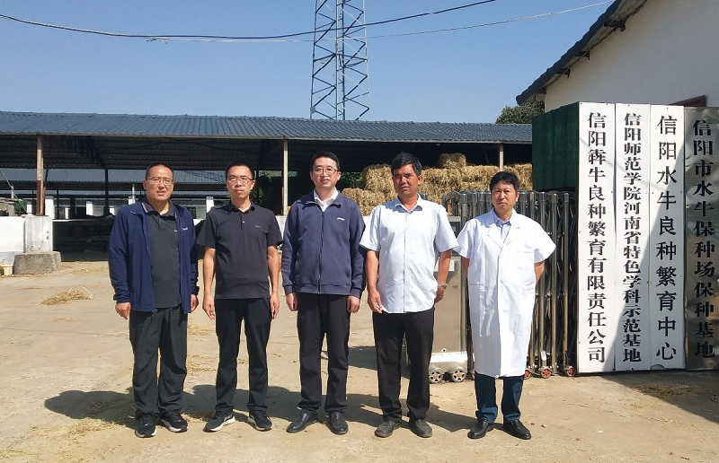 10月5日,由动物科技学院学术副院长何书海、专业教师王俊锋、李军等5人组成的科技服务团,前往信阳犇牛良种繁育有限公司,就水牛疾病防控和饲料营养调配开展技术指导和服务。此次活动的目的是提升公司水牛养殖的技术水平,促进信阳地区水牛种质资源的保护、优选和利用。