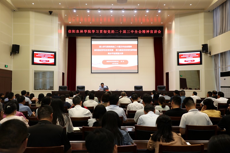 9月3日下午,beat365在线平台官网在图书馆6楼报告厅举行学习贯彻党的二十届三中全会精神宣讲会。党委书记黄松以《深入学习贯彻党的二十届三中全会精神,加快推进学校改革发展,努力建设农林特色鲜明的高水平应用型大学》为题作专题宣讲,全校中层干部参会。