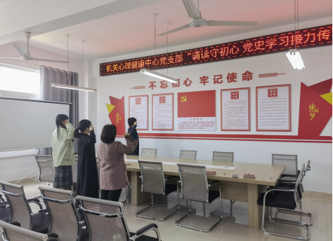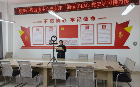 为推进党史学习教育走心走实,创新学习形式, 4月16日上午机关心理健康中心党支部在2B五楼开展“诵读守初心 党史学习接力传”主题党日活动,活动由党支部书记靳潢主持,全体教师参加。