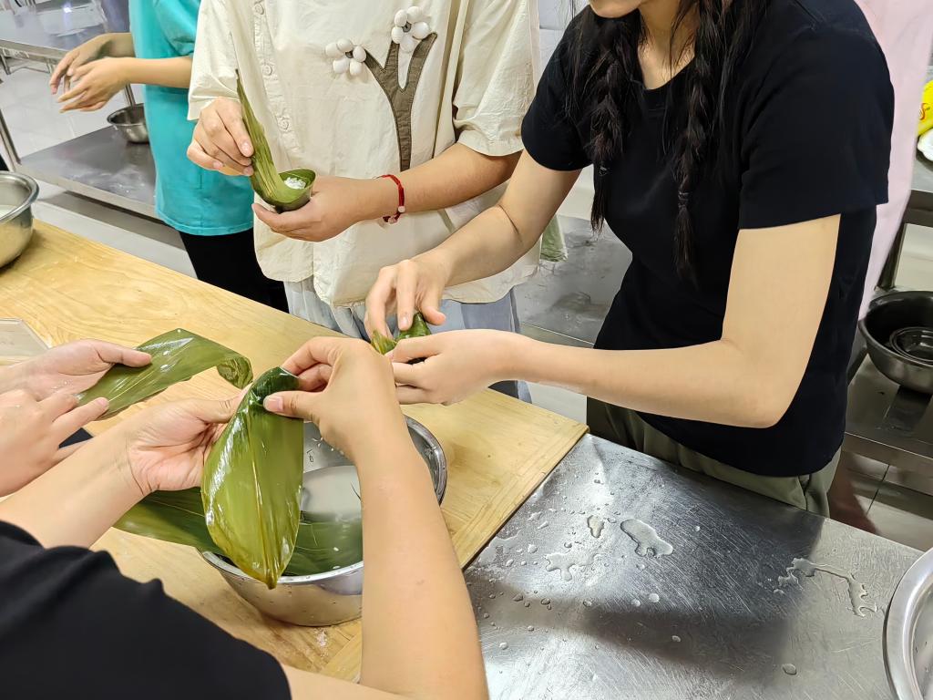 从制作粽子的材料发下去的那刻起,同学们便开始积极参与制作。一道道工序有条不紊的进行,同学们制作粽子的手法也五花八门,但大家都不约而同的沉浸在制作粽子的过程中,享受烹饪所带来的乐趣。